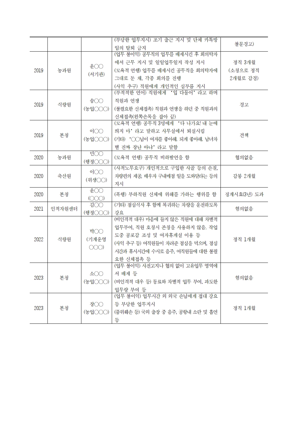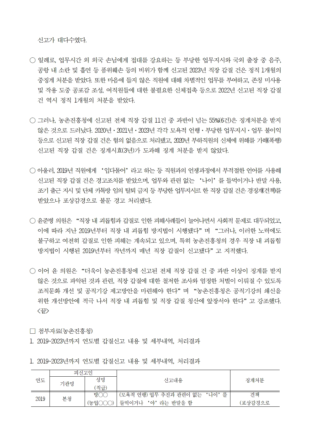 [윤준병 의원 국정감사 보도자료] 5년간 농촌진흥청 매년 갑(甲)질 신고에도_ 55% 징계 안받아!