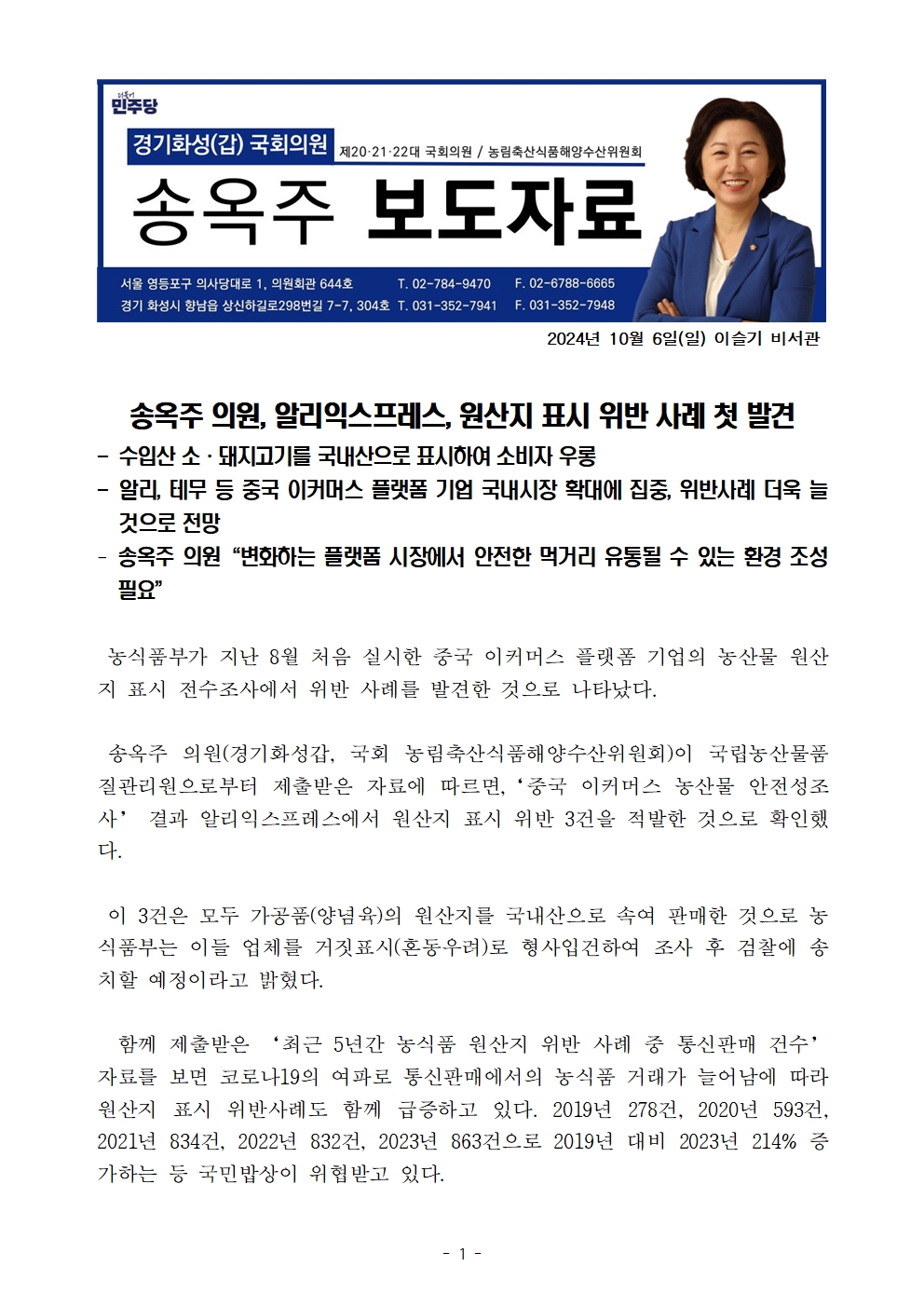 [국회의원 송옥주 국정감사 보도자료] 송옥주 의원, 알리익스프레스, 원산지 표시 위반 사례 첫 발견
