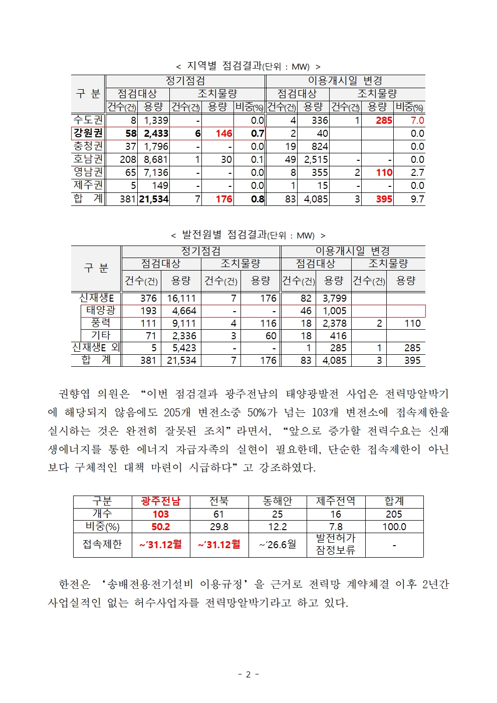 [국회의원 권향엽] 권향엽 “전력망알박기 확인 결과 광주전남 태양광은 해당사항 없음”