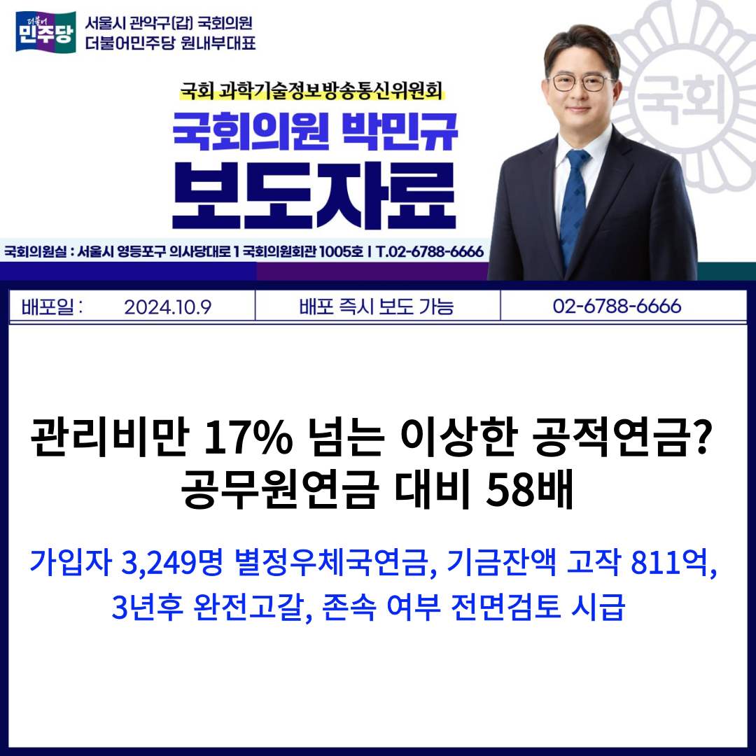 [박민규 국회의원 국정감사 보도자료] 관리비만 17% 넘는 이상한 공적연금? 공무원연금 대비 58배