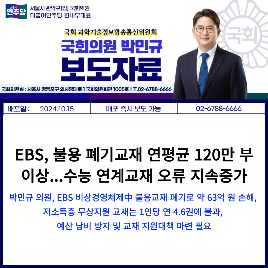 [박민규 국회의원 국정감사 보도자료] EBS, 불용 폐기교재 연평균 120만 부 이상...수능 연계교재 오류 지속증가
