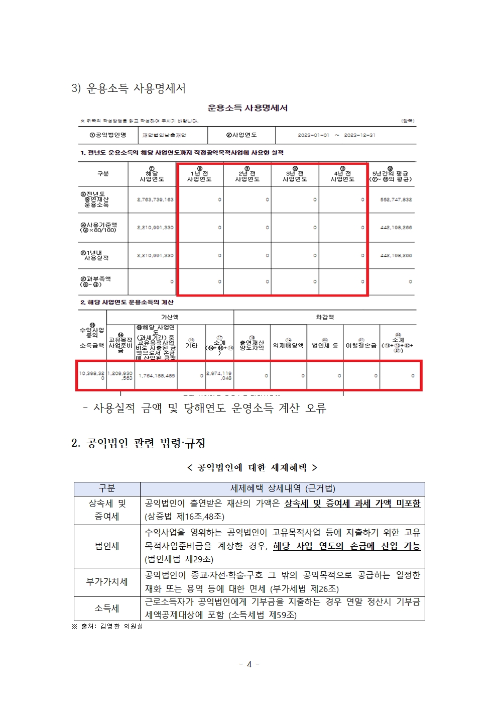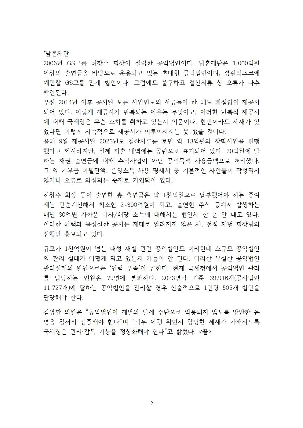 [김영환 의원(고양시 정) 보도자료] 세제 혜택 먹튀 수단으로 전락한 공익법인, 관리는 엉망
