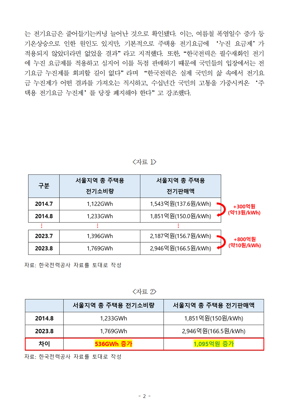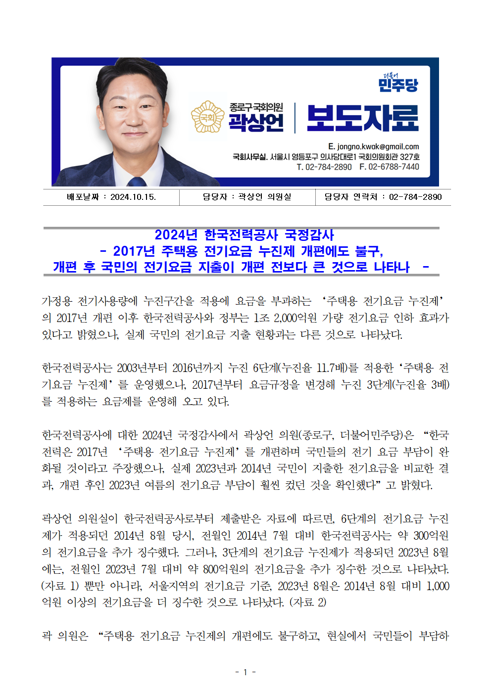 [국회의원 곽상언] 2017년 주택용 전기요금 누진제 개편에도 불구, 개편 후 국민의 전기요금 지출이 개편 전보다 큰 것으로 나타나