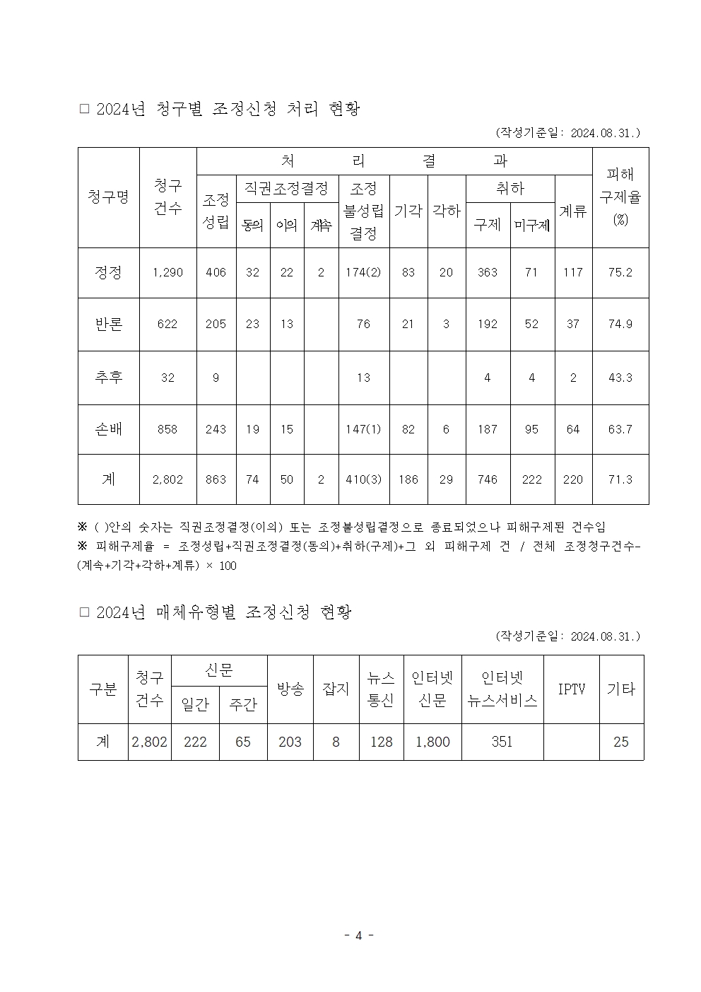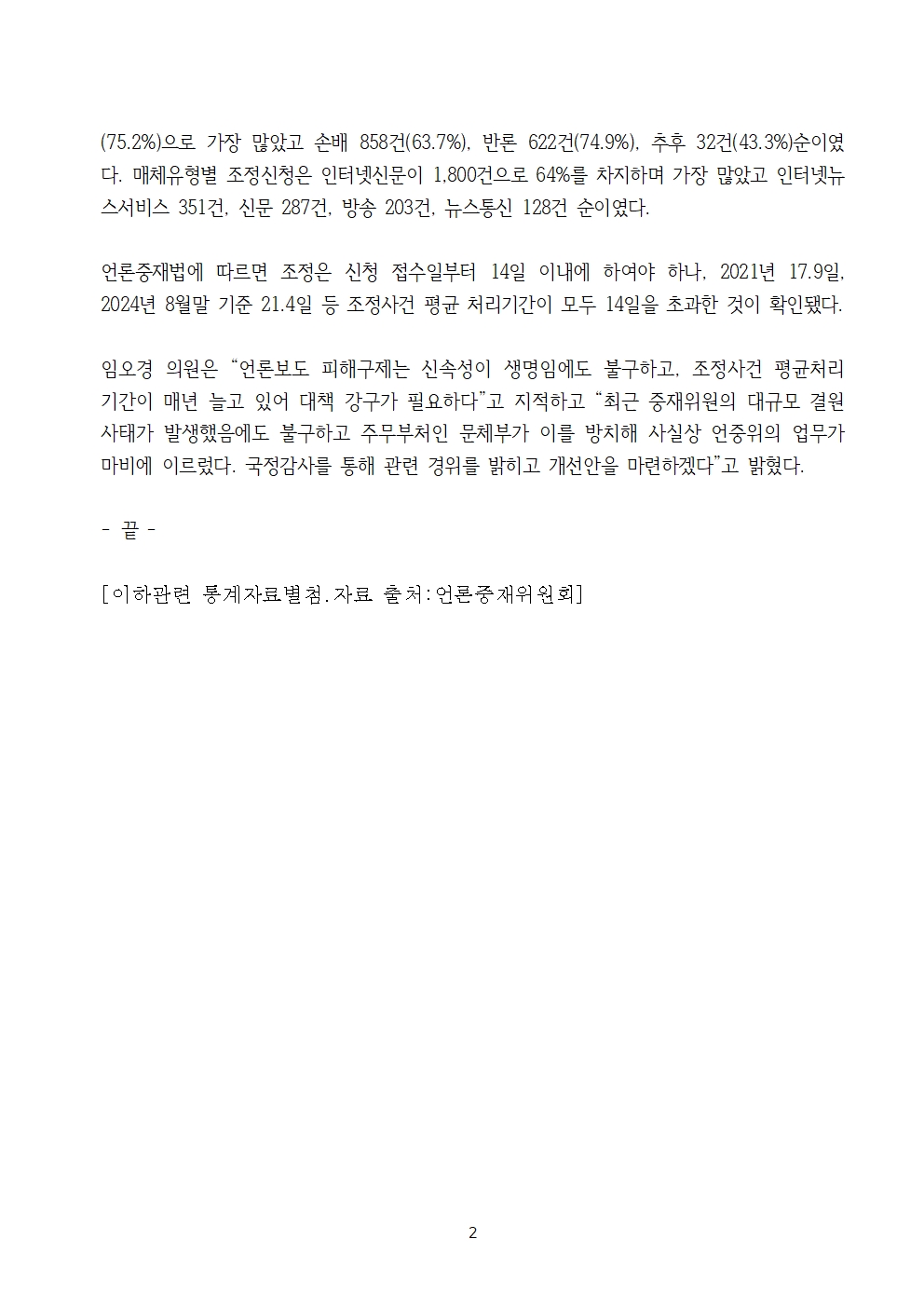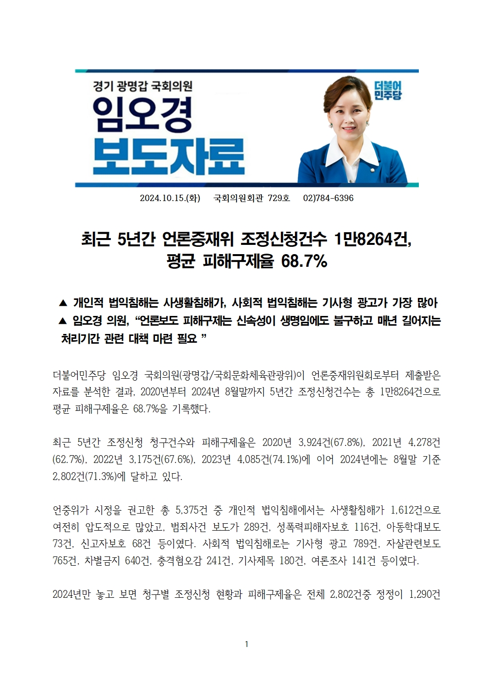[국회의원 임오경 국감보도자료] 최근 5년간 언론중재위 조정신청건수 1만8264건, 평균 피해구제율 68.7%