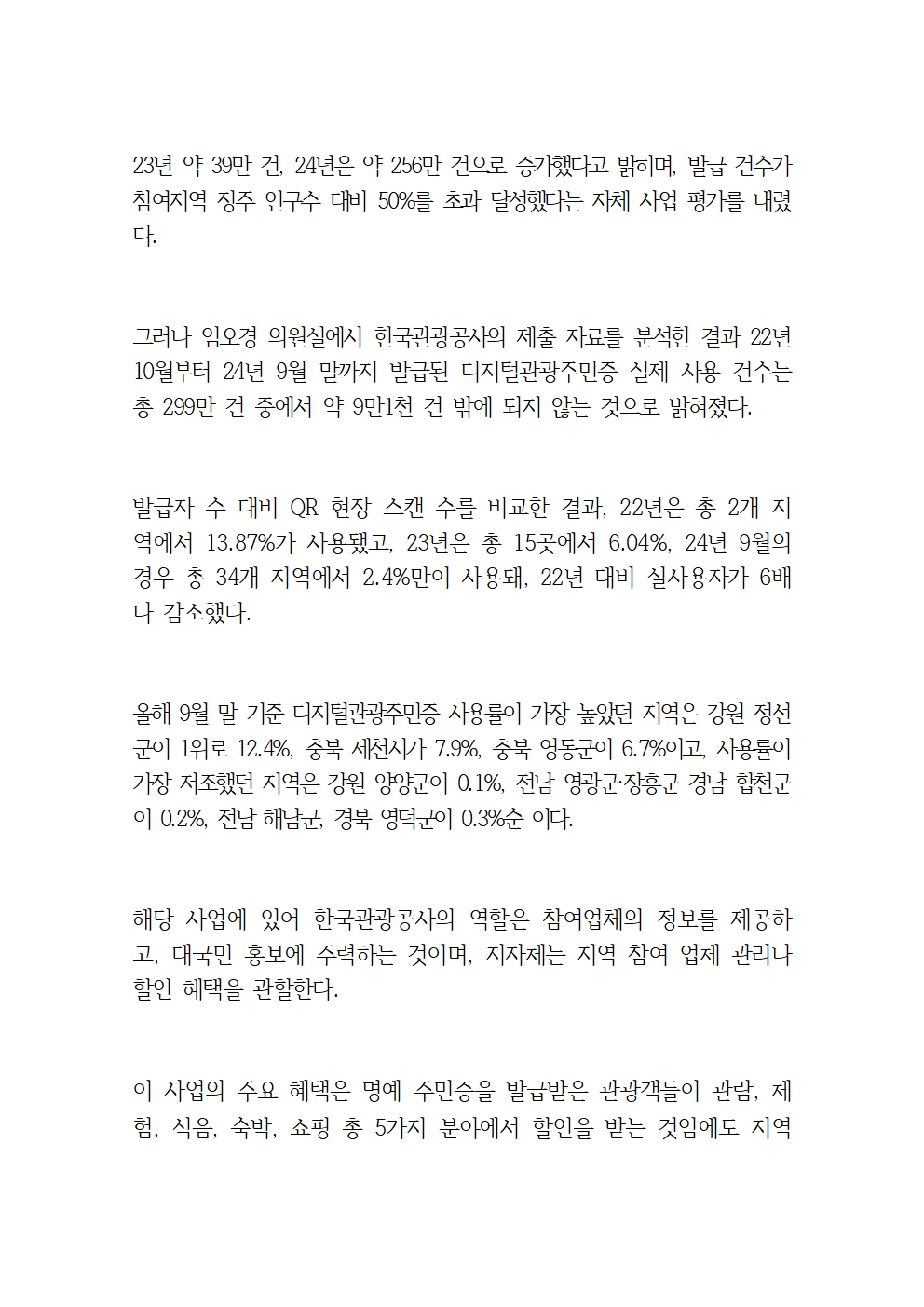 [국회의원 임오경 국감보도자료]디지털관광주민증, 발급 건수가 아닌 실사용률을 늘려야