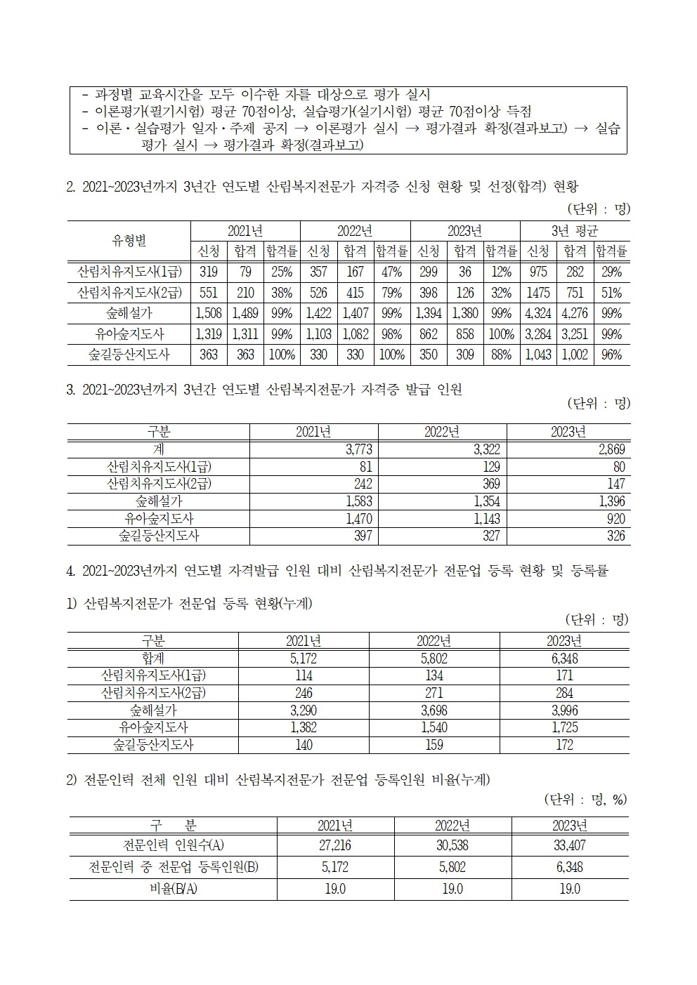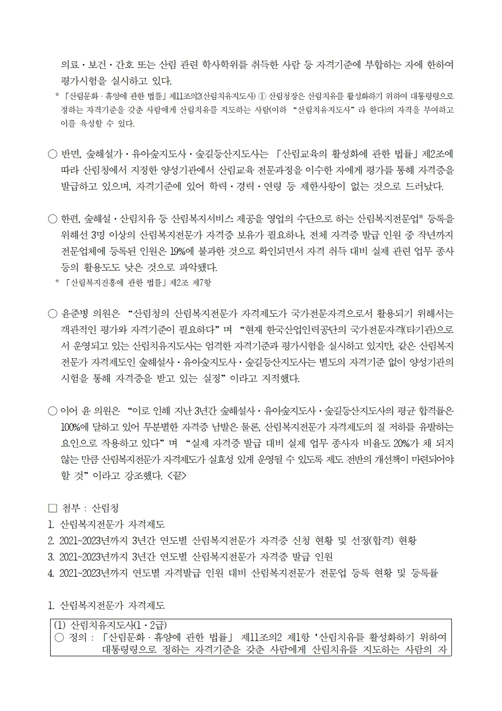 [윤준병 의원 국정감사 보도자료] 윤준병 의원 “산림청의 산림복지전문가 자격제도별 합격률 ‘천차만별’”