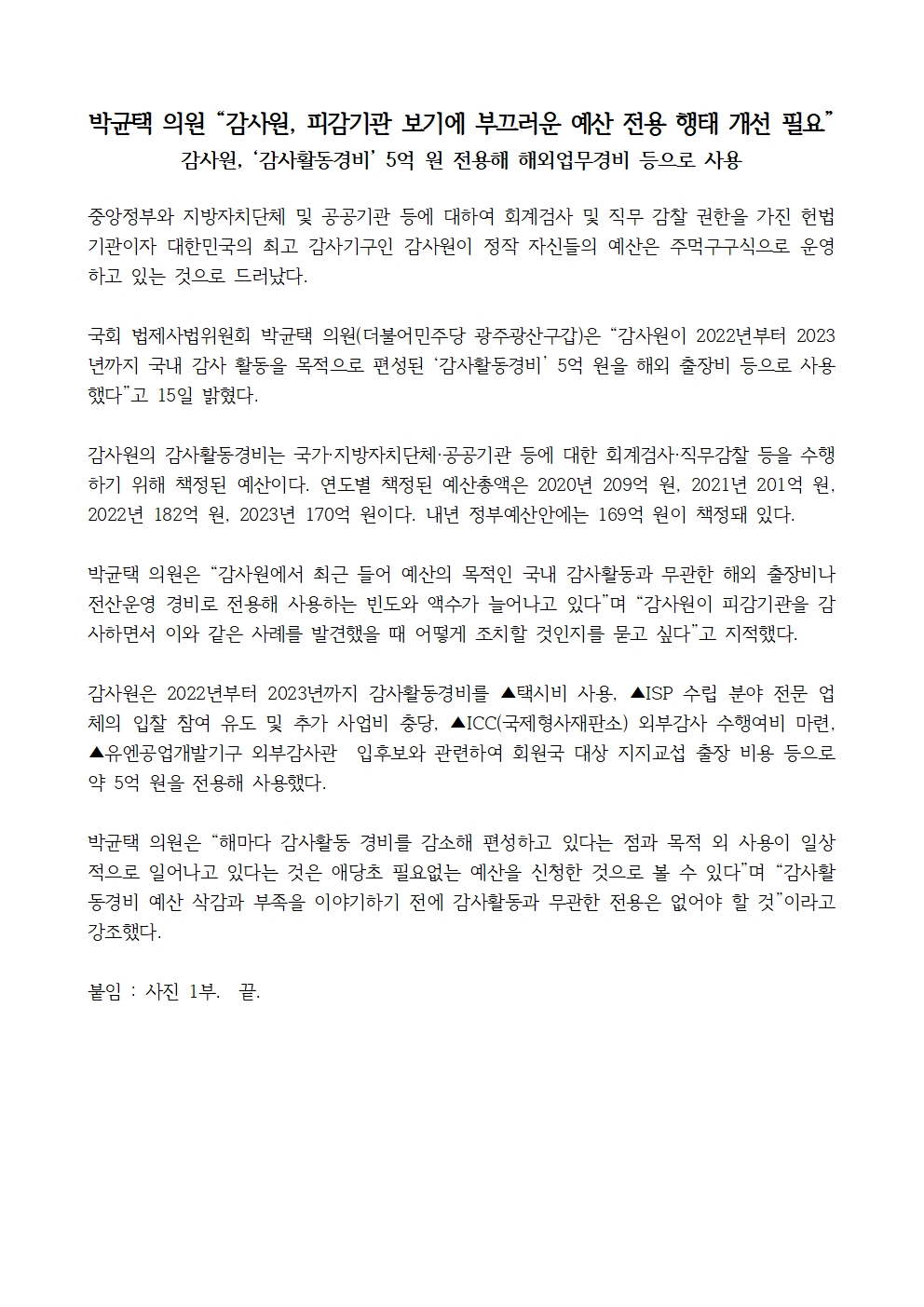 241015_국정감사 보도자료_박균택 의원_“감사원 예산 전용 행태 개선 필요”.hwp