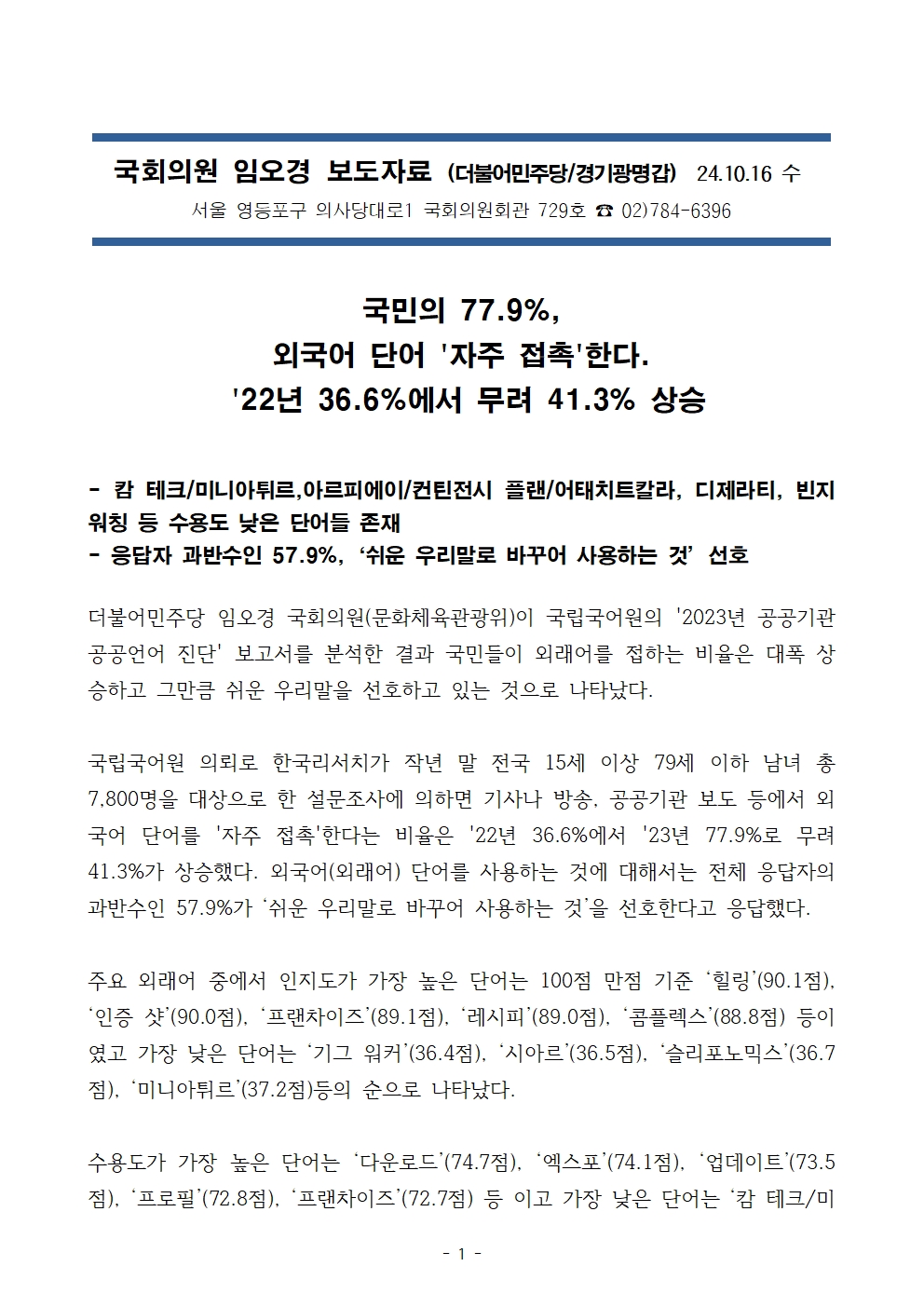 241016 [임오경 국회의원 보도자료]외국어 단어 자주 접촉한다..hwp