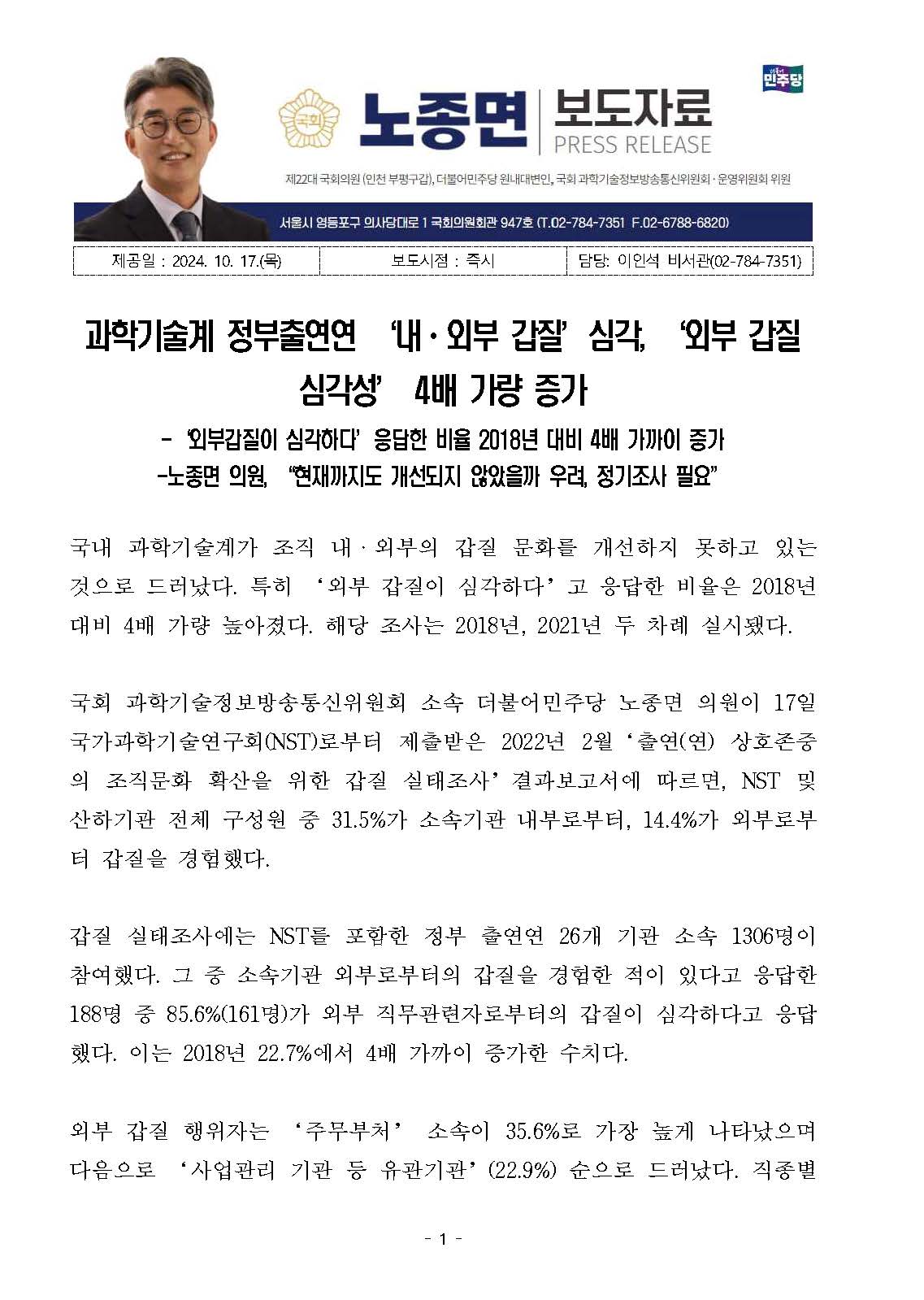 241017_노종면의원_보도자료_과학기술계_정부출연연_‘내ㆍ외부_갑질’심각__‘외부_갑질_심각성’_4배_가량_증가.hwp