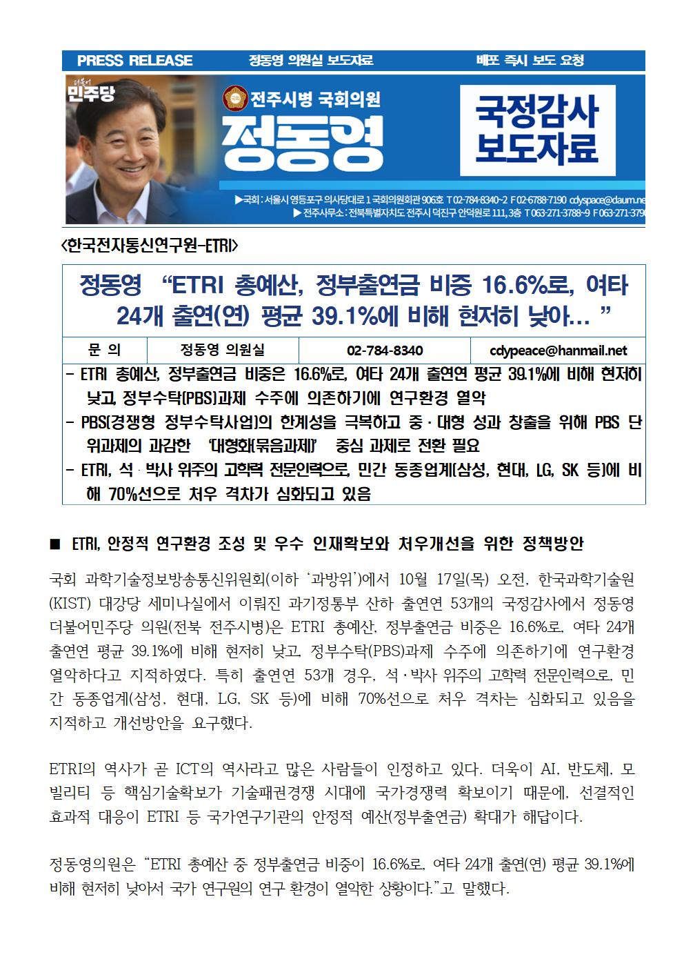 [국회의원 정동영 국감보도자료] 정동영 “ETRI 총예산, 정부출연금 비중 16.6%로, 여타 24개 출연(연) 평균 39.1%에 비해 현저히 낮아... ”
