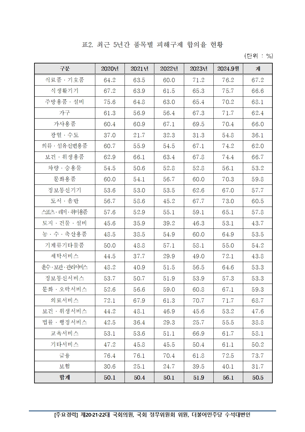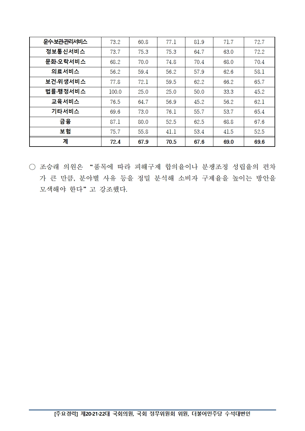 [국회의원 조승래] 최근 5년간 한국소비자원 피해구제 합의율 가장 낮은 분야는 ‘보험’