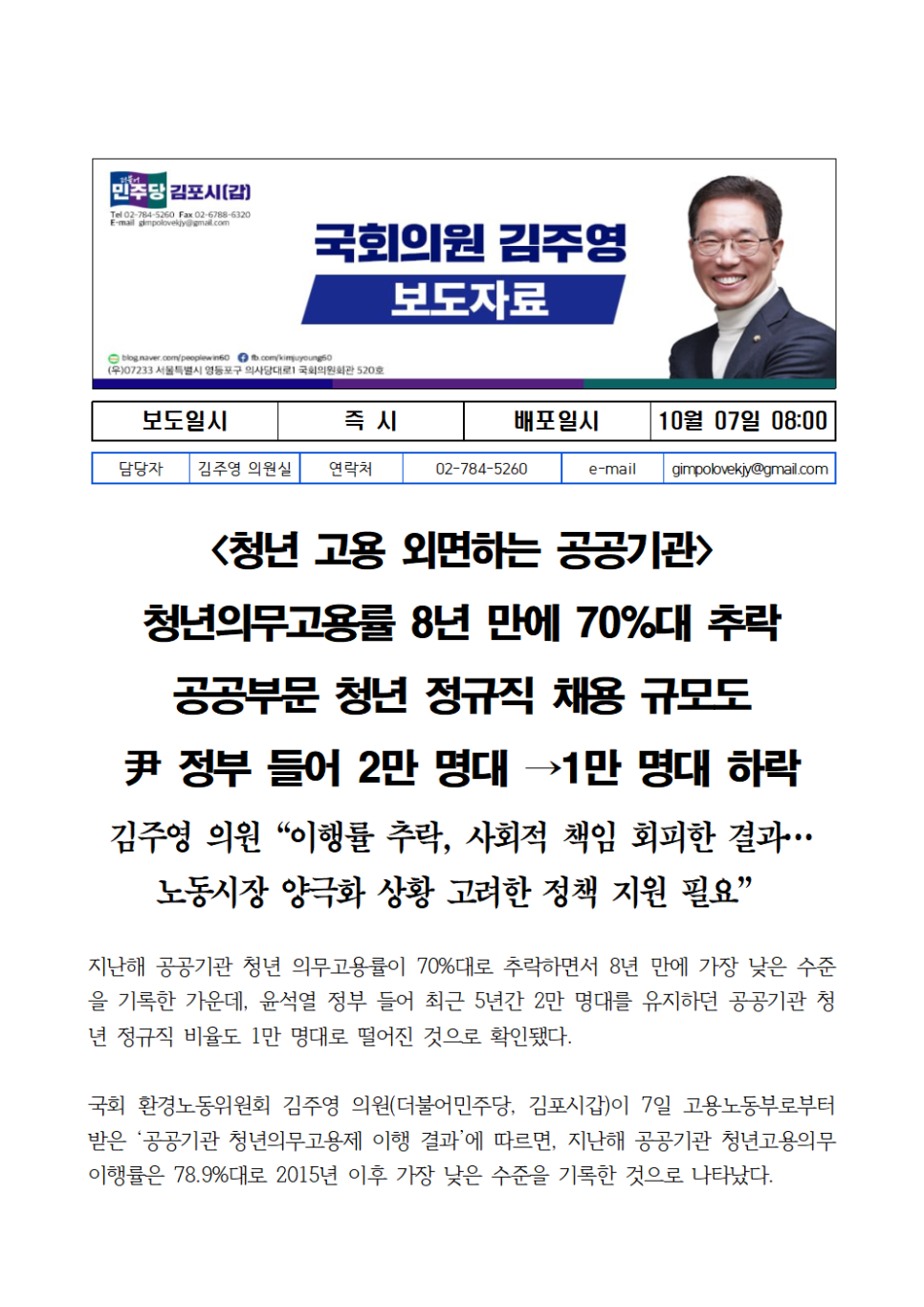 [국회의원 김주영] 청년의무고용률 8년 만에 70%대 추락 공공부문 청년 정규직 채용 규모도 尹 정부 들어 2만 명대 →1만 명대 하락