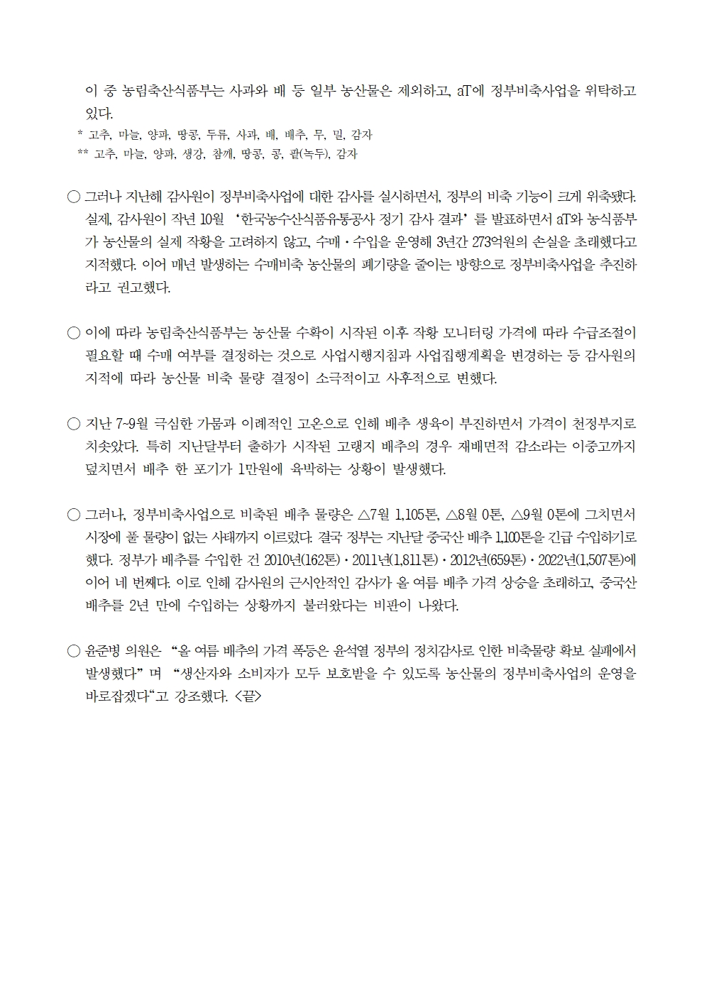 241018 [윤준병 의원 국정감사 보도자료] 윤준병 의원_ 배추값 급등과 중국산 배추 긴급수입_ 근시안적 감사에 기인.hwp