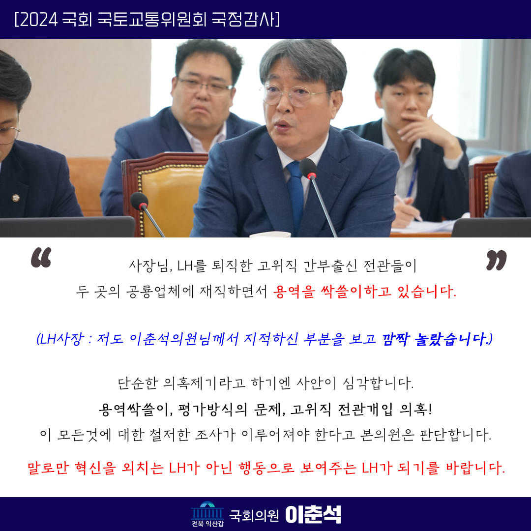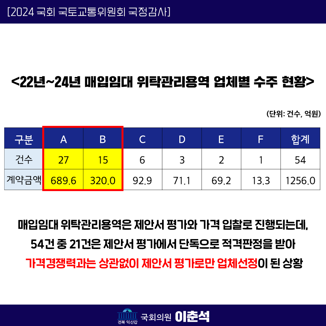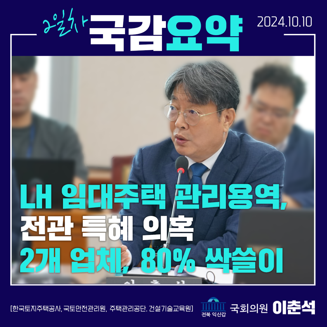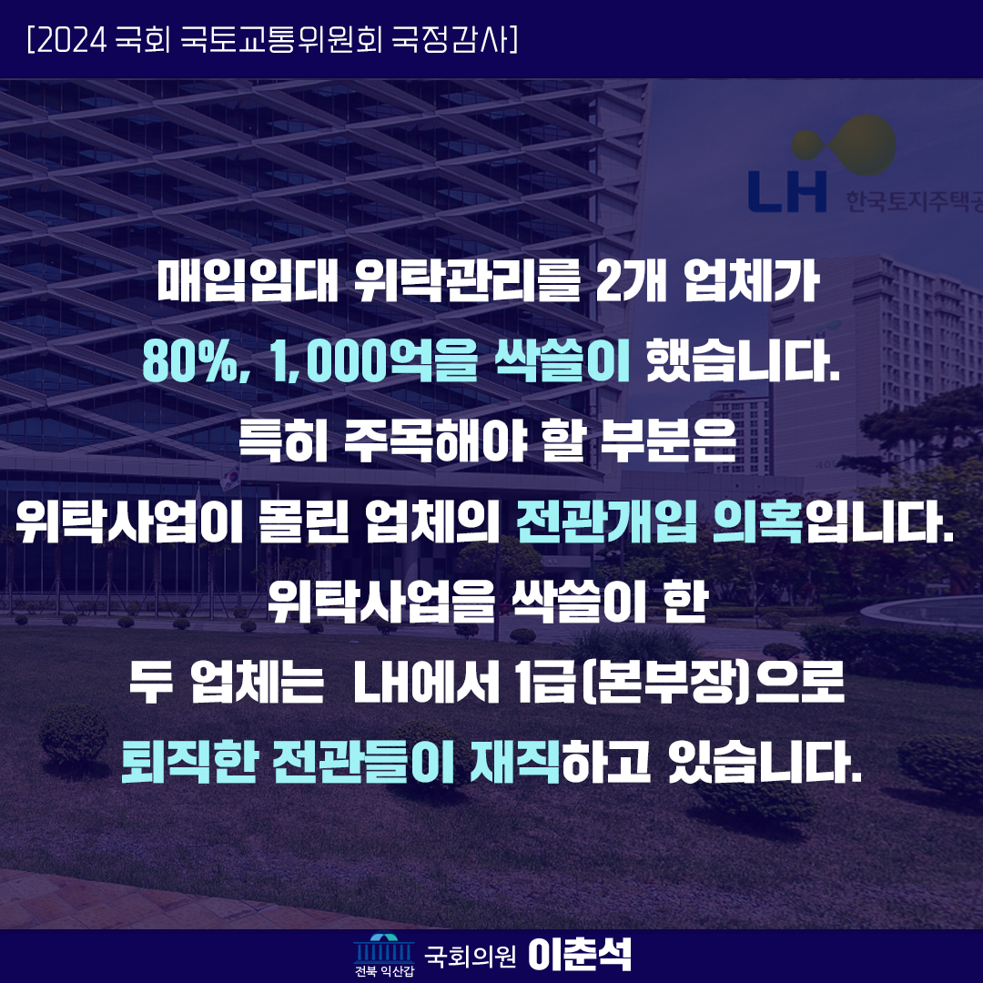 [이춘석 의원 국정감사 카드뉴스] LH 임대주택 관리용역, 전관 특혜 의혹! 2개 업체, 80% 싹쓸이