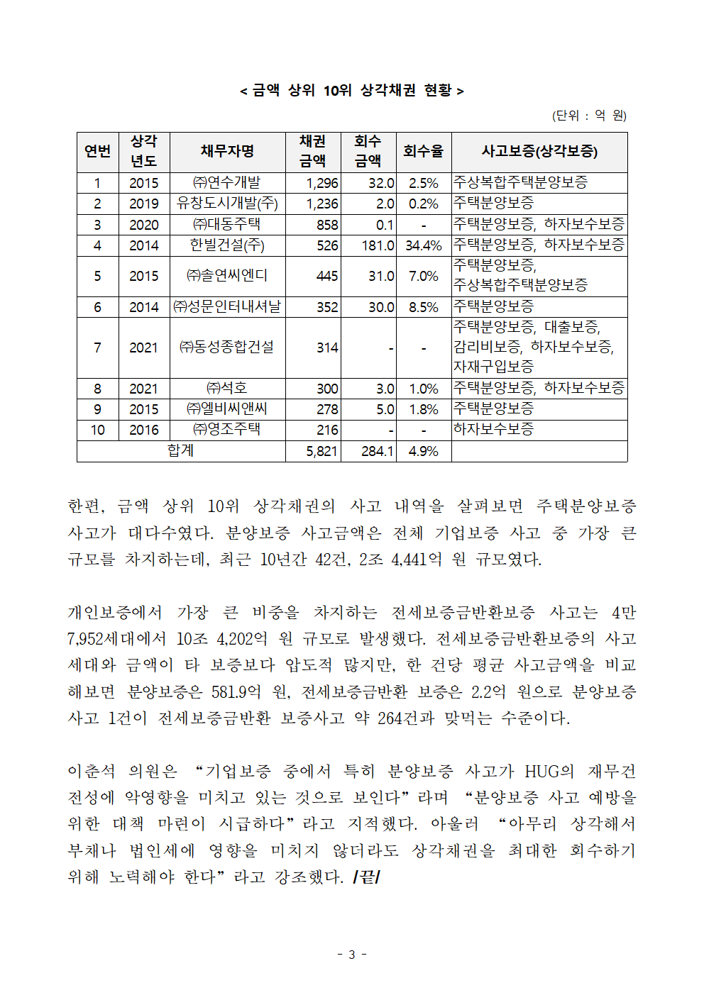 [이춘석 의원 국정감사 보도자료] 이춘석 의원, HUG가 부채에서 지운 부실채권 ‘채권 상각’ 4조 원 넘어