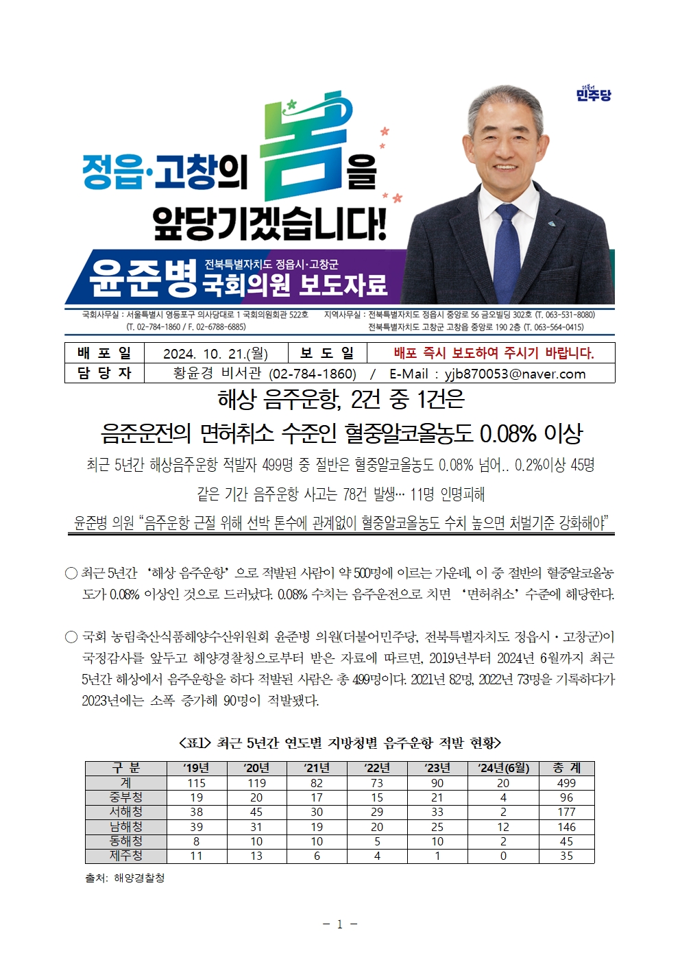 [윤준병 의원 국정감사 보도자료] 해상음주운항 2건 중 1건은 음준운전의 면허취소 수준인 혈중 알코올 농도 0.08%이상