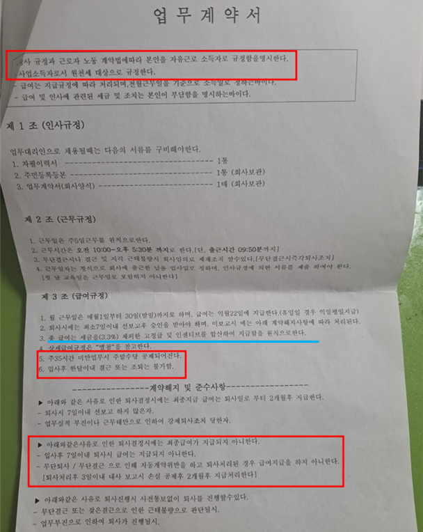 해당 콜센터 업무계약서에 “당사 규정과 근로자 노동 계약법에 따라 본인을 자유근로 소득자로 규정함을 명시한다”, “사업소득자로서 원천세 대상으로 규정한다”며 노동자를 개인사업자로 분류했다. (그림5 참조)