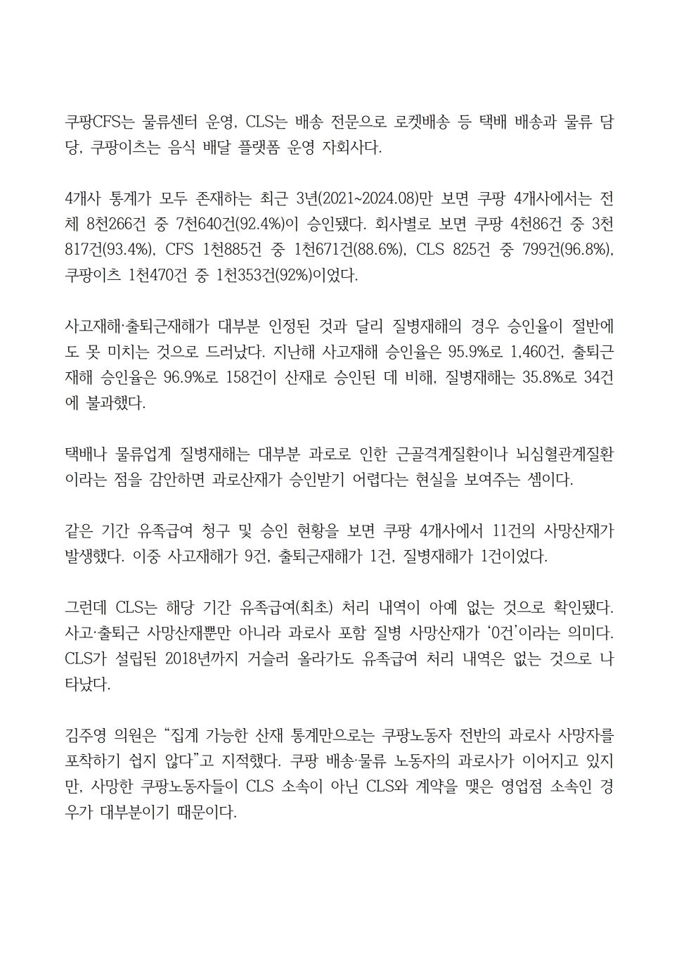 김주영 의원은 “집계 가능한 산재 통계만으로는 쿠팡노동자 전반의 과로사 사망자를 포착하기 쉽지 않다”고 지적했다. 쿠팡 배송‧물류 노동자의 과로사가 이어지고 있지만, 사망한 쿠팡노동자들이 CLS 소속이 아닌 CLS와 계약을 맺은 영업점 소속인 경우가 대부분이기 때문이다.