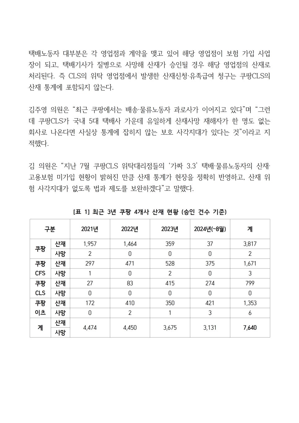 [국회의원 김주영] 쿠팡 4개사 3년간 산재 총 7,640건: 택배노동자 과로사 이어지는데...쿠팡CLS 산재사망 “0건”?
