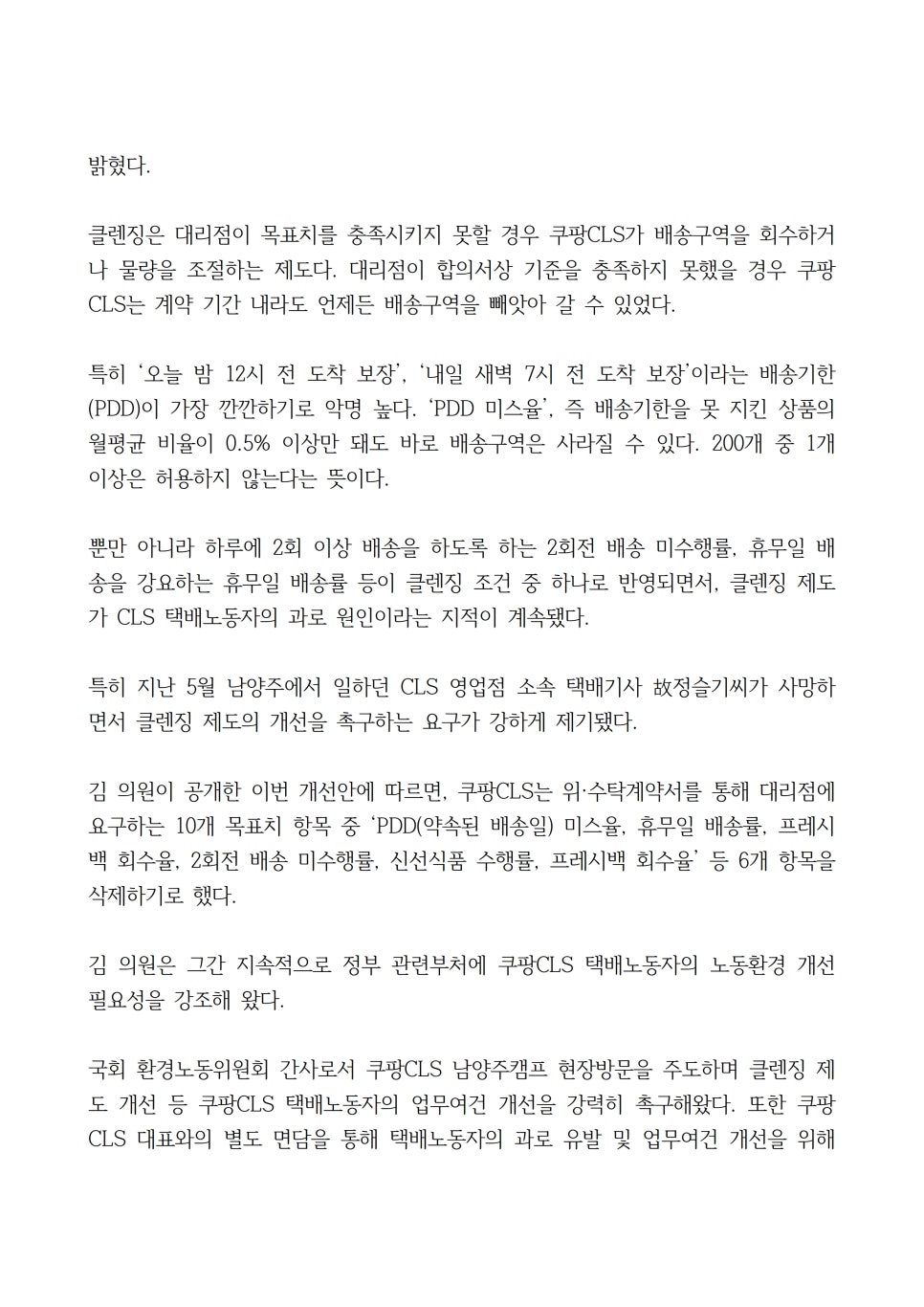 김 의원은 2일 ‘쿠팡CLS 클렌징 제도 개선방안’(붙임 참조)을 공개하며 “현재 영업점 계약서에 반영돼있는 배송기한(Promised Delivery Date, PDD) 미스율, 휴무일 배송률, 2회전 배송 미수행률 등 클렌징 항목 6개를 삭제하는 내용을 반영했다”고 밝혔다.