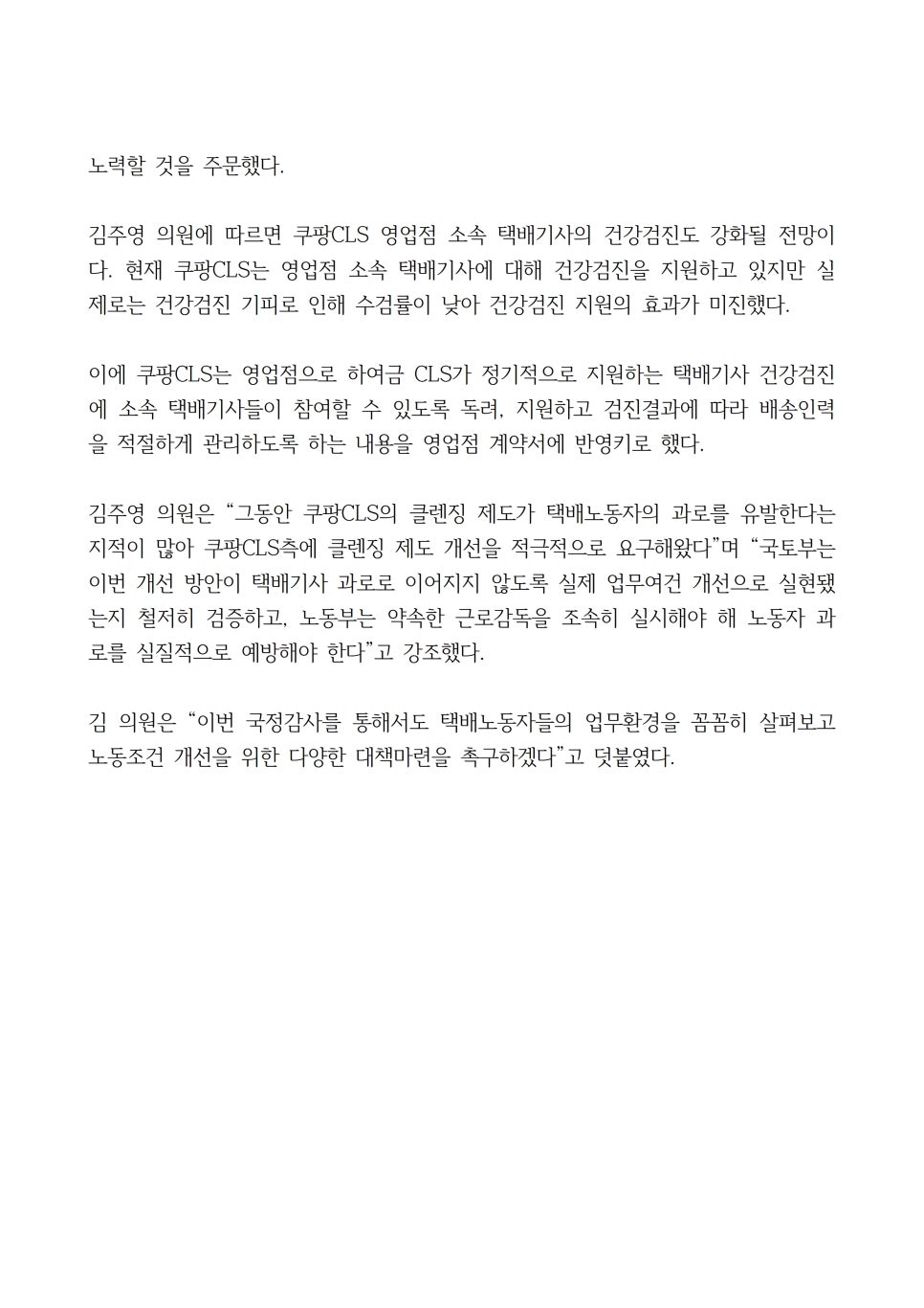 김 의원은 그간 지속적으로 정부 관련부처에 쿠팡CLS 택배노동자의 노동환경 개선 필요성을 강조해 왔다.