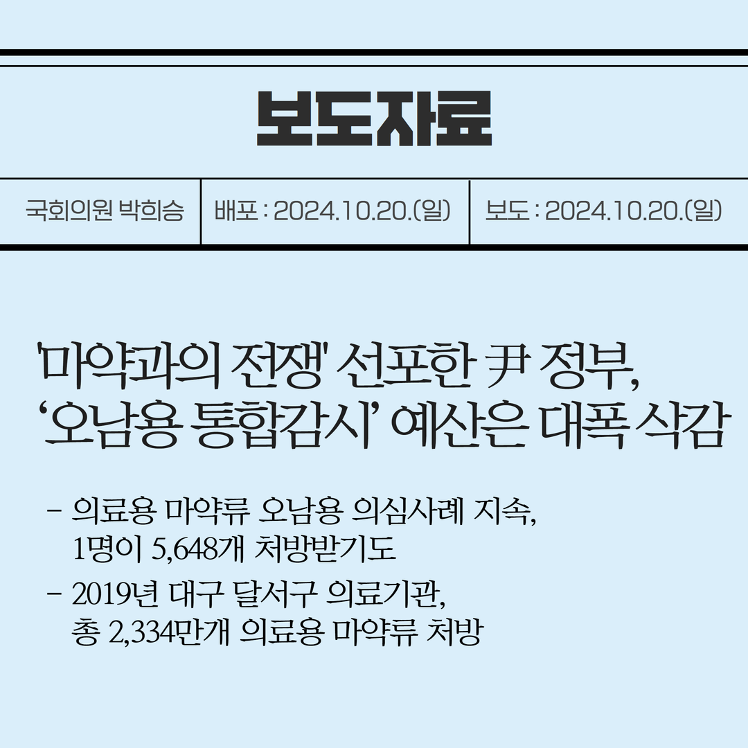 [국회의원 박희승 보도자료] '마약과의 전쟁' 선포한 尹 정부, ‘오남용 통합감시’ 예산은 대폭 삭감