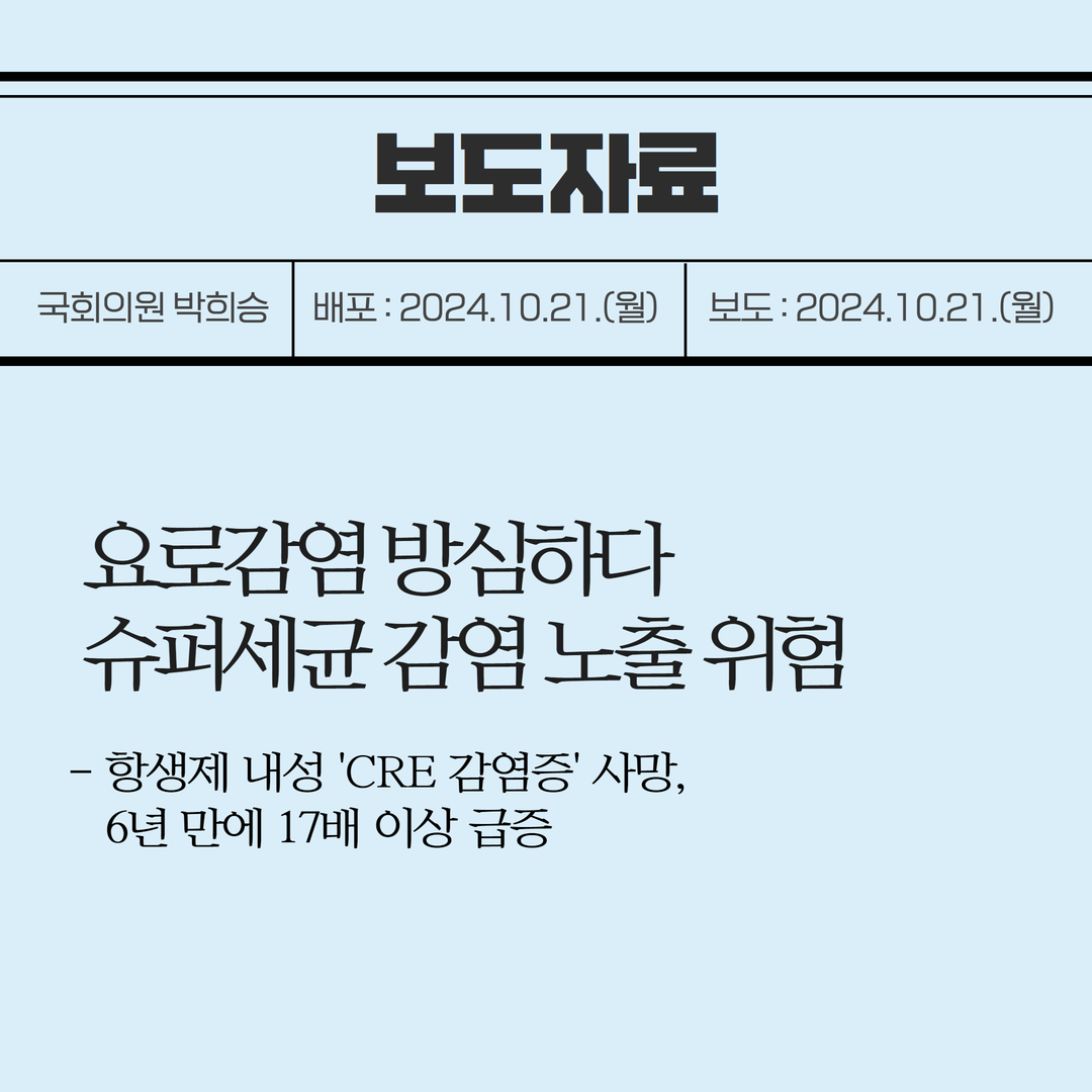 [국회의원 박희승 보도자료] 요로감염 방심하다 슈퍼세균 감염 노출 위험