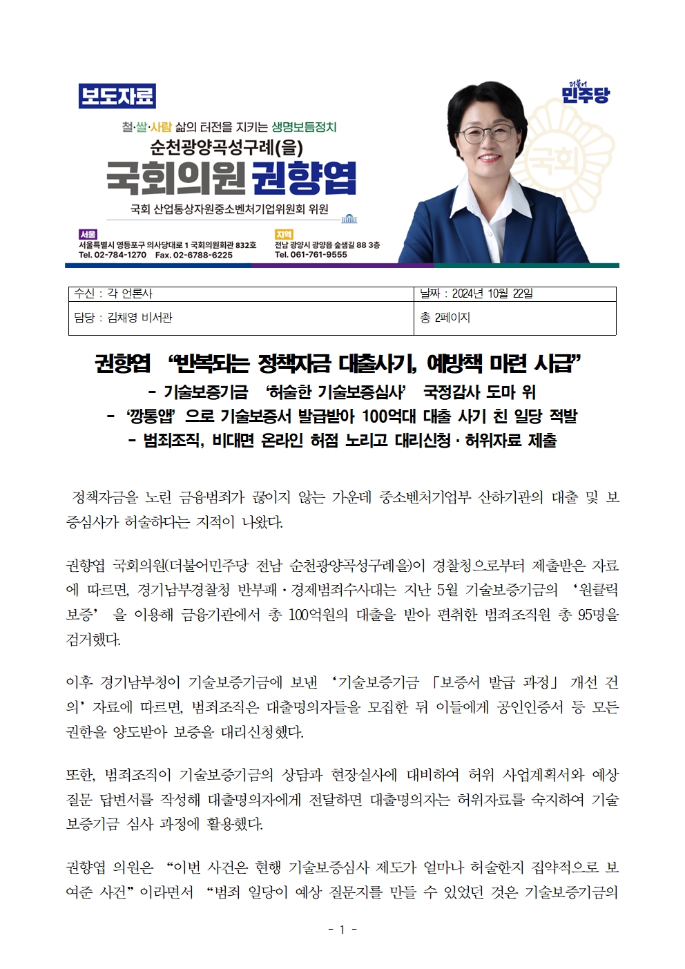 [권향엽 국회의원]_241022_권향엽 반복되는 정책자금 대출사기 예방책 마련 시급.hwp