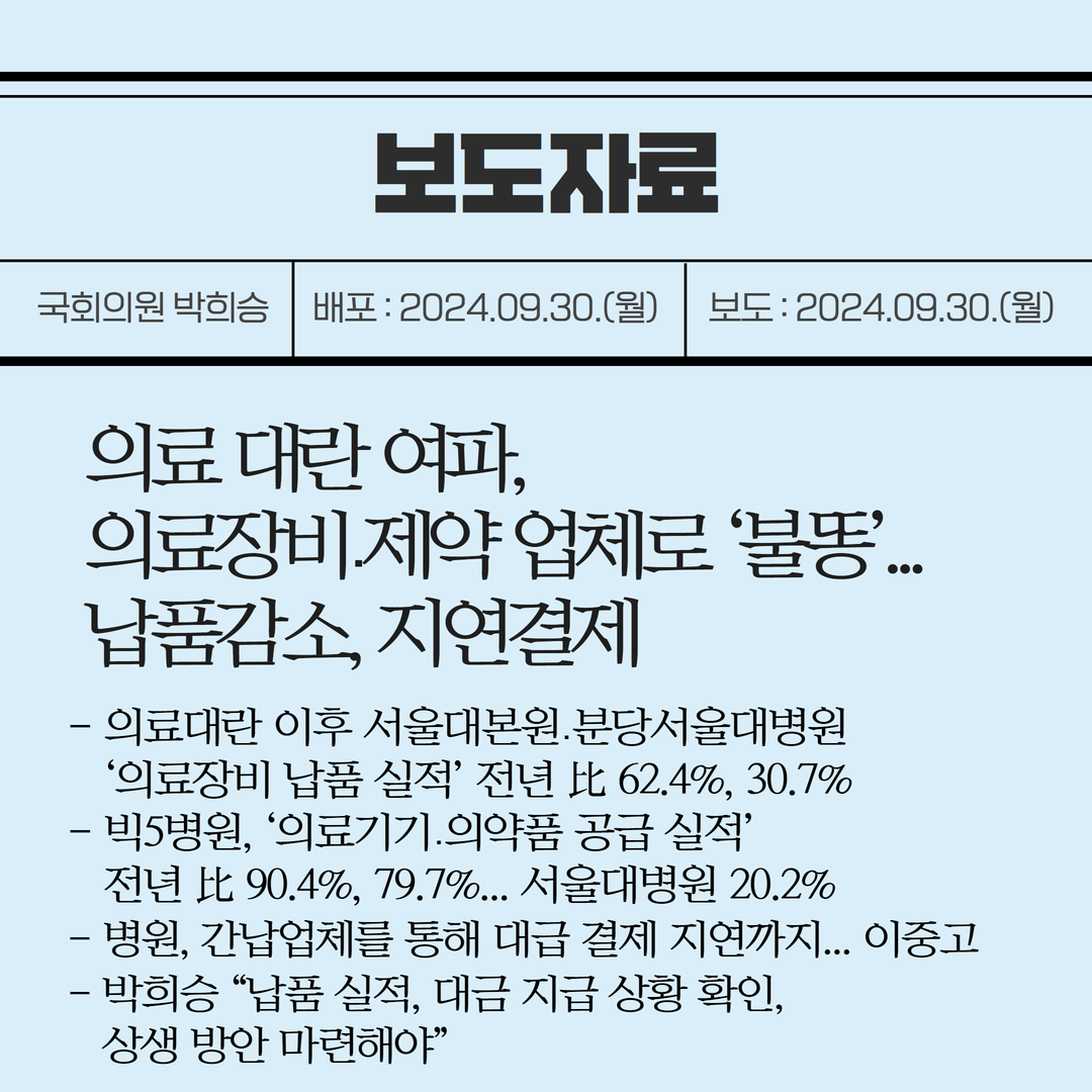 [국회의원 박희승 보도자료] 의료 대란 여파, 의료장비․제약 업체로 ‘불똥’... 납품감소, 지연결제
