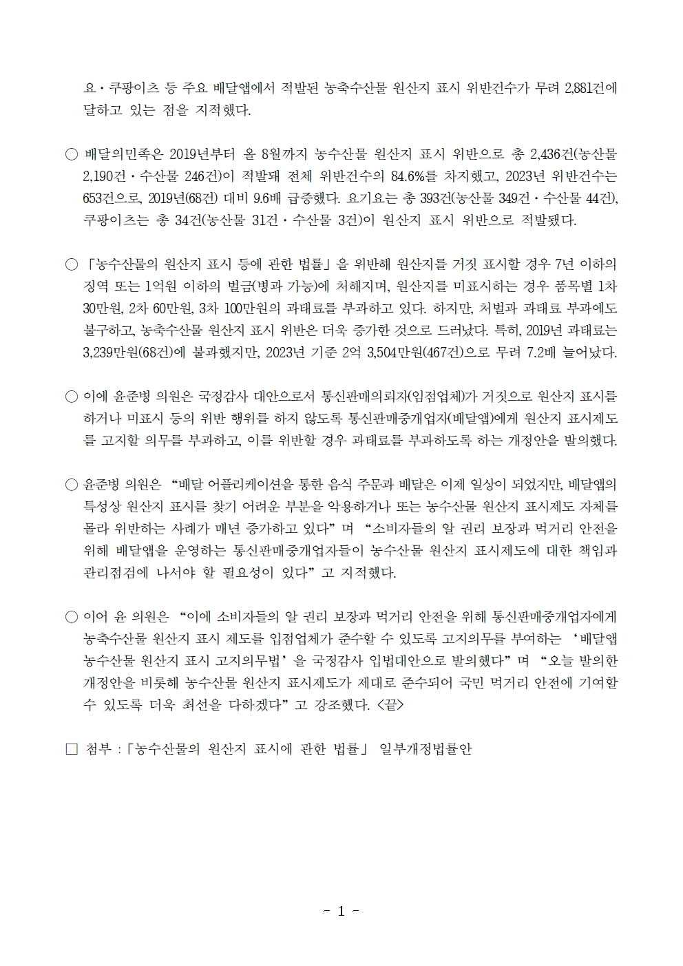 241023 [윤준병 의원 국정감사 보도자료] 국정감사 대안 ‘배달앱 농수산물 원산지 표시 고지의무법’ 발의.hwp
