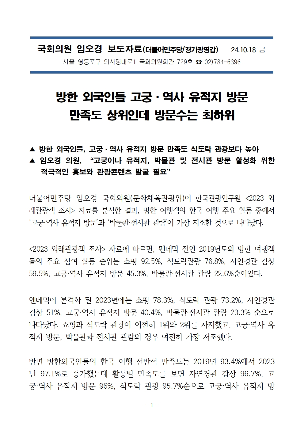241018 [임오경 국회의원 보도자료] 방한 외국인들 고궁·역사 유적지 방문 만족도 상위인데 방문수는 최하위.hwp