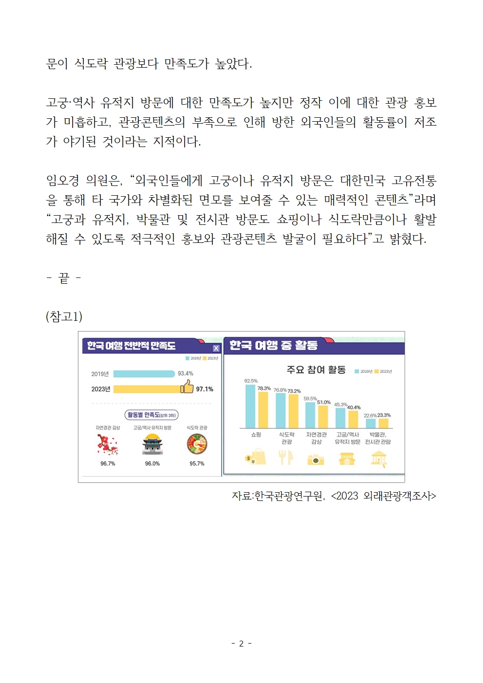 [국회의원 임오경 국감보도자료]방한 외국인들 고궁·역사 유적지 방문 만족도 상위인데 방문수는 최하위