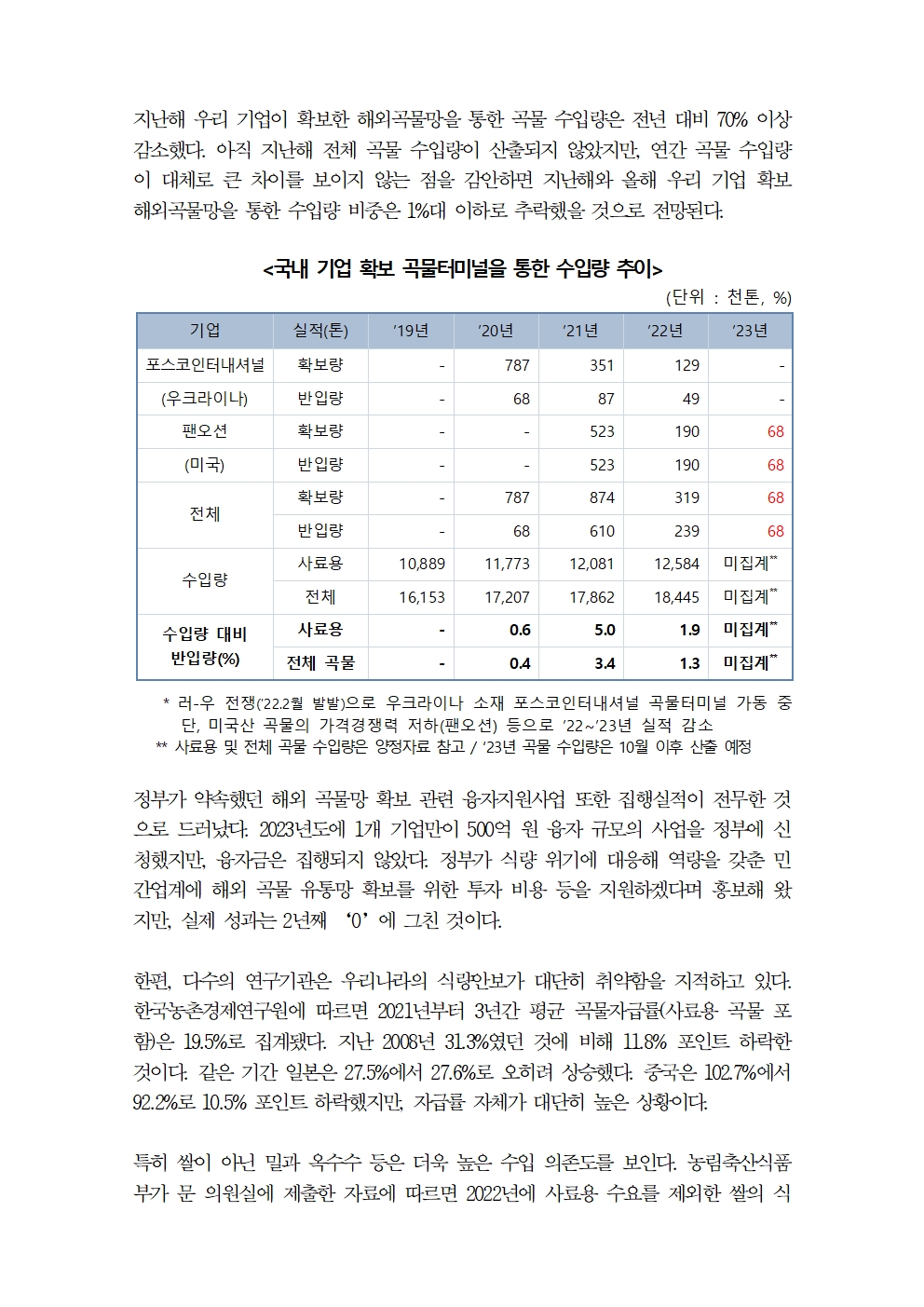 [국회의원 문대림] 식량위기 대한민국, 곡물자급률도 낮은데 해외곡물망 확보도 ‘빈손’