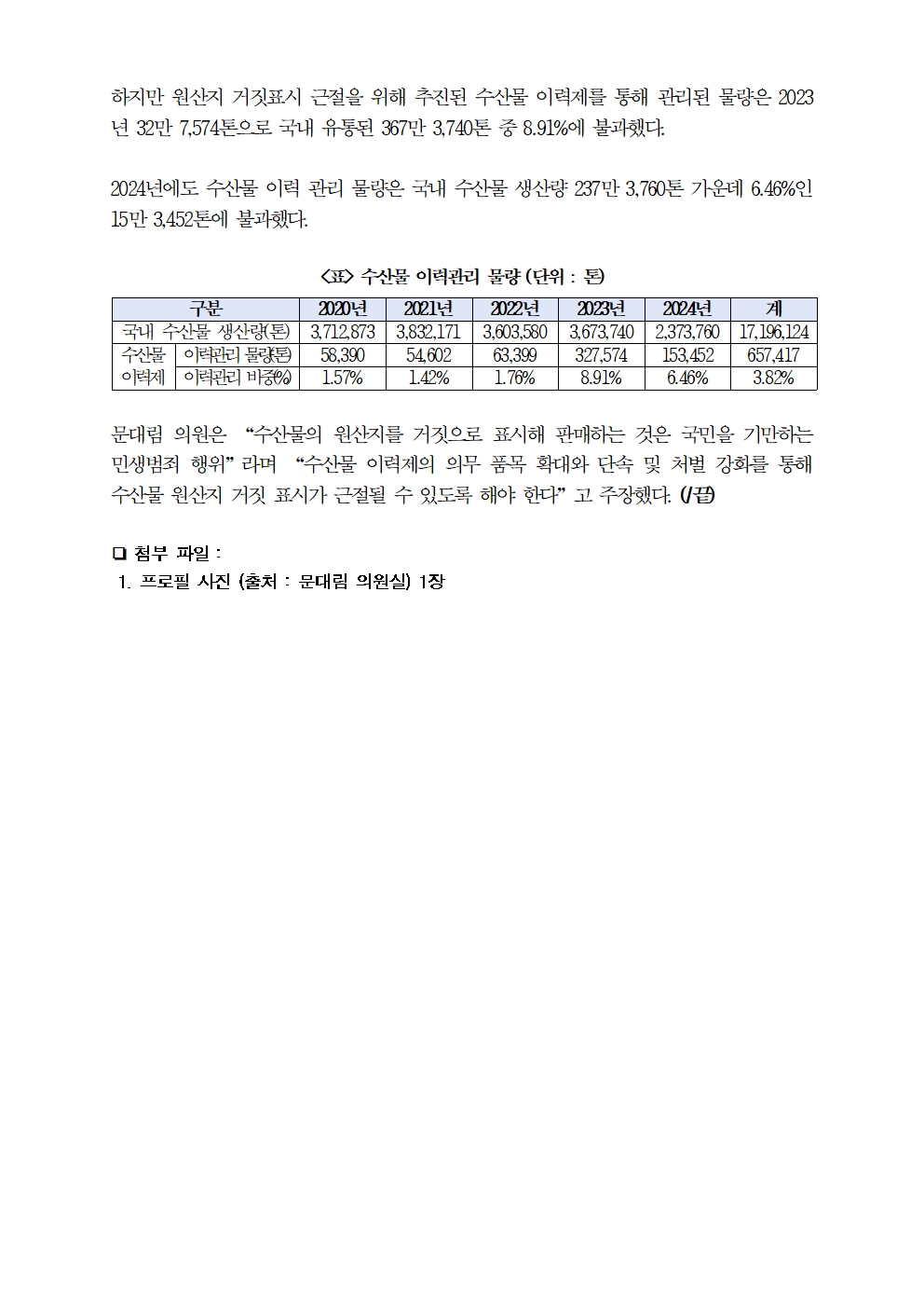[국회의원 문대림] “2023년 수산물 원산지 거짓표시 1,103건 적발, 수산물이력제 관리 물량은 고작 8.91%”