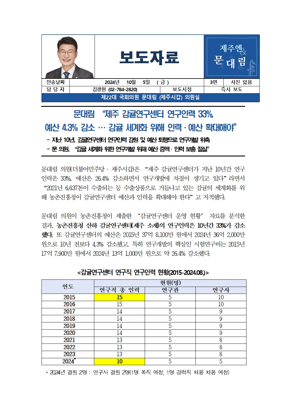 [국회의원 문대림] 제주 감귤연구센터 연구인력 33%, 예산 4.3% 감소 … 감귤 세계화 위해 인력·예산 확대해야