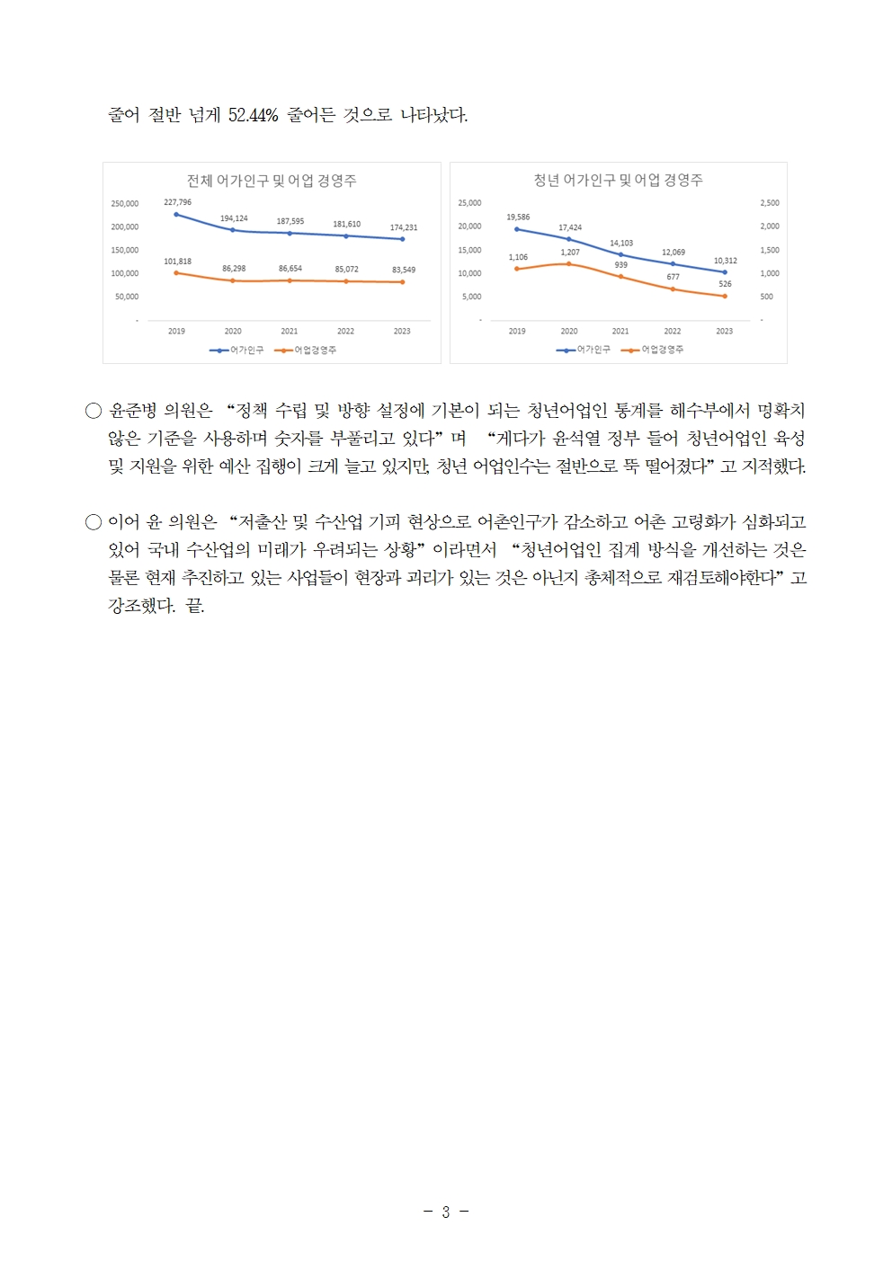 [윤준병 의원 국정감사 보도자료] 어가인구=어업인_ 청년어업인 통계 부풀리는 해양수산부