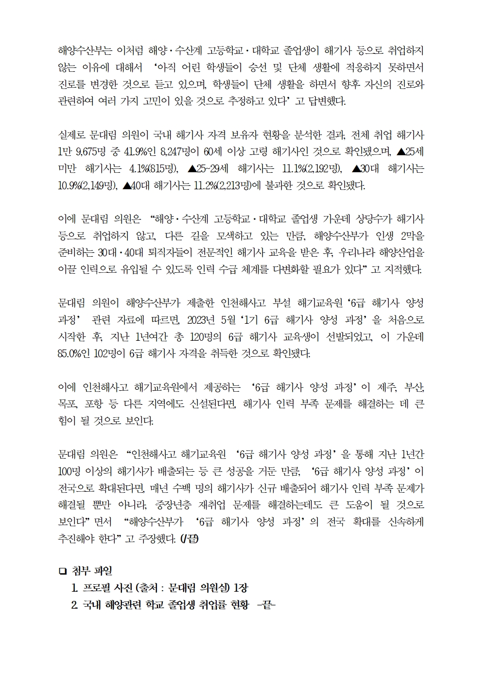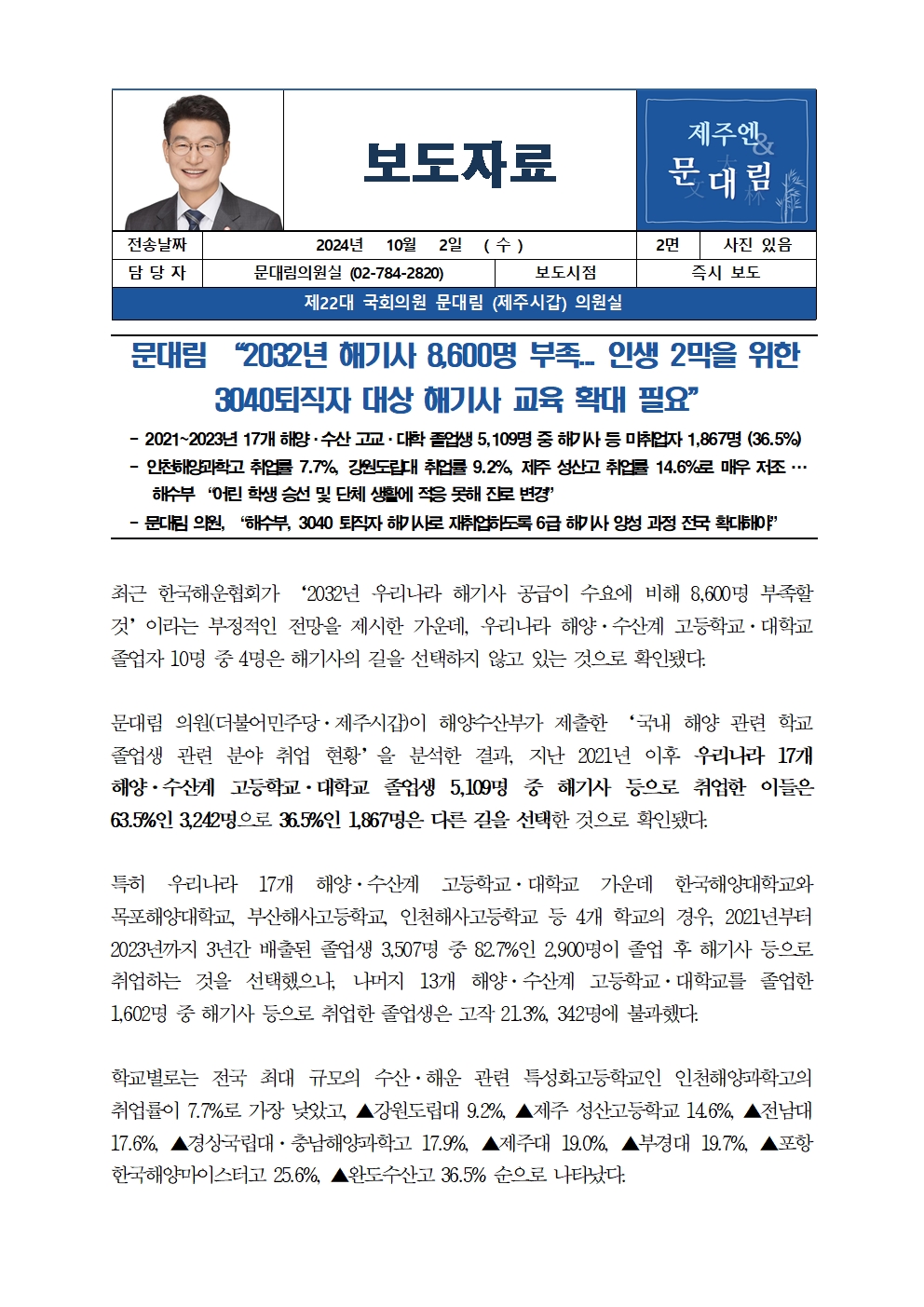 [국회의원 문대림] 2032년 해기사 8,600명 부족... 인생 2막을 위한 3040퇴직자 대상 해기사 교육 확대 필요