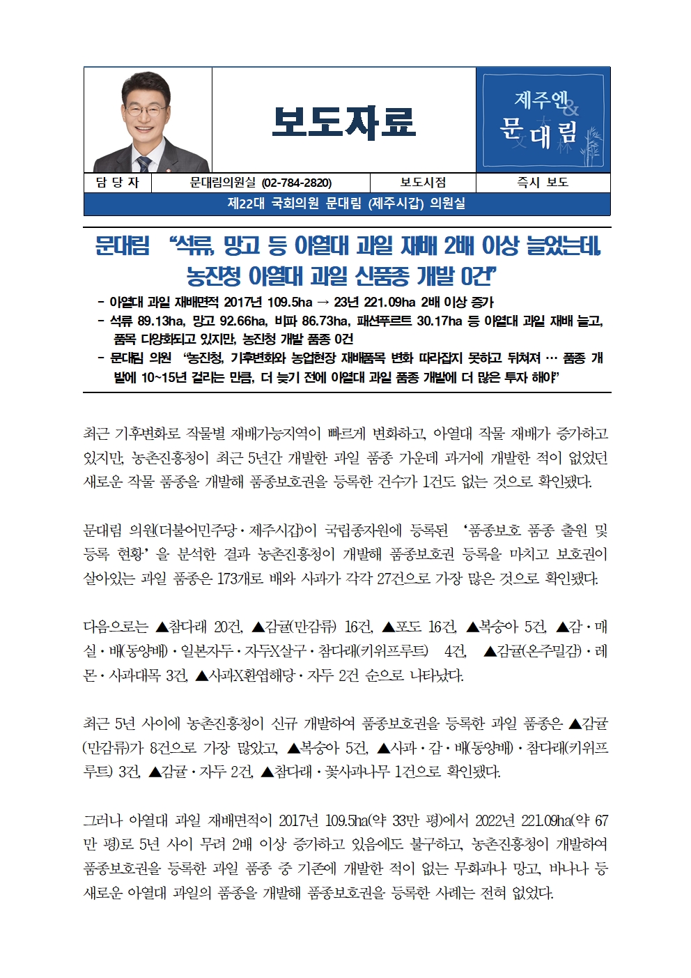[국회의원 문대림] 석류, 망고 등 아열대 과일 재배 2배 이상 늘었는데, 농진청 아열대 과일 신품종 개발 0건