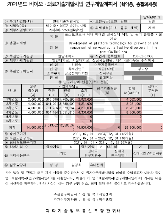 붙임 1. 2021년도 바이오‧의료기술개발사업 연구개발계획서(총괄책임자 : 김형숙)