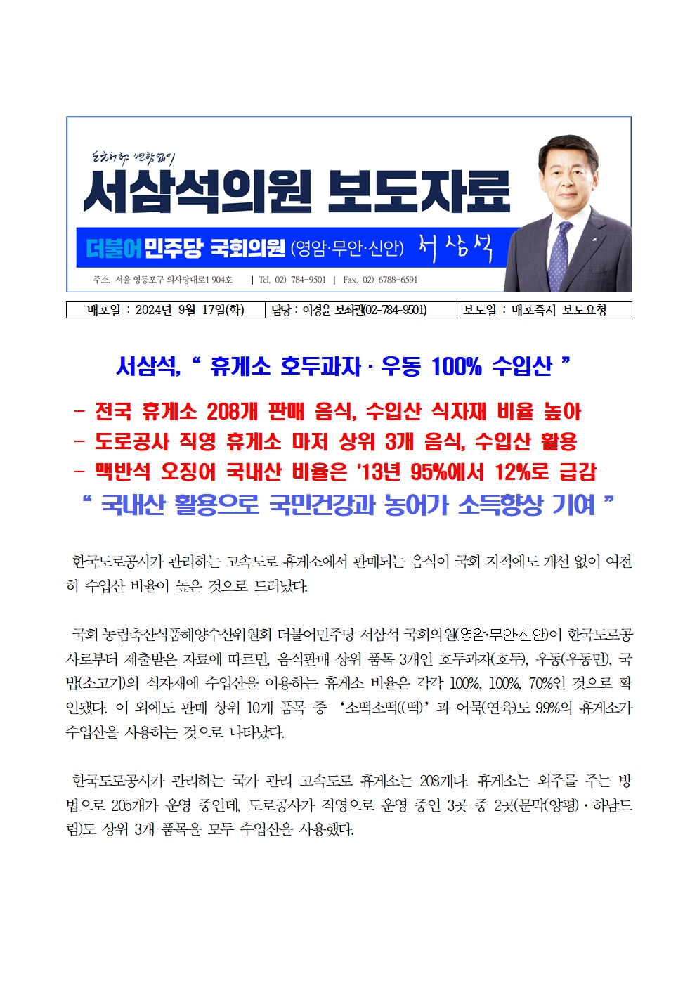 [국회의원 서삼석] 휴게소 호두과자·우동 100% 수입산