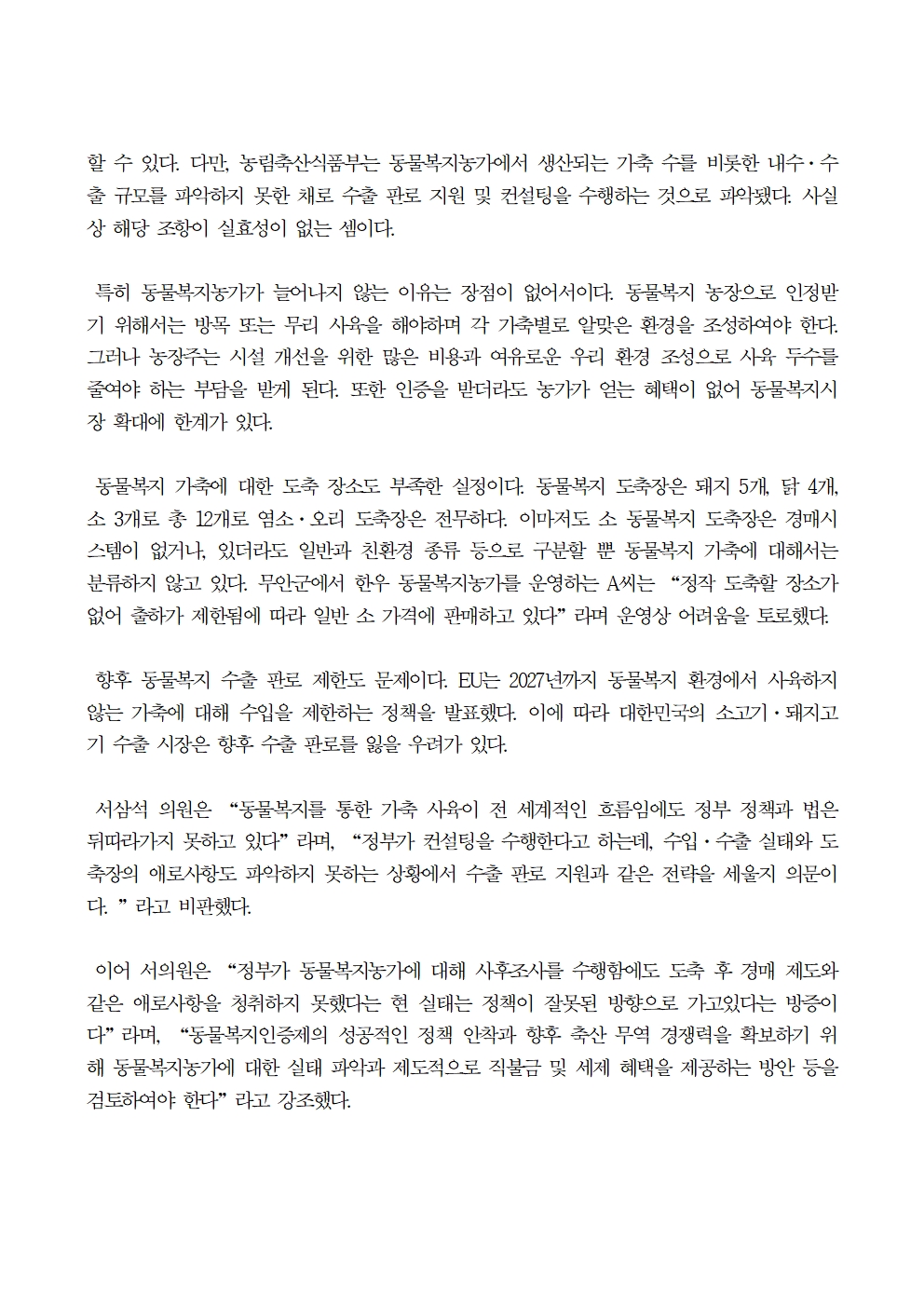 [국회의원 서삼석] 유명무실한 동물복지농가제 인센티브 도입 필요