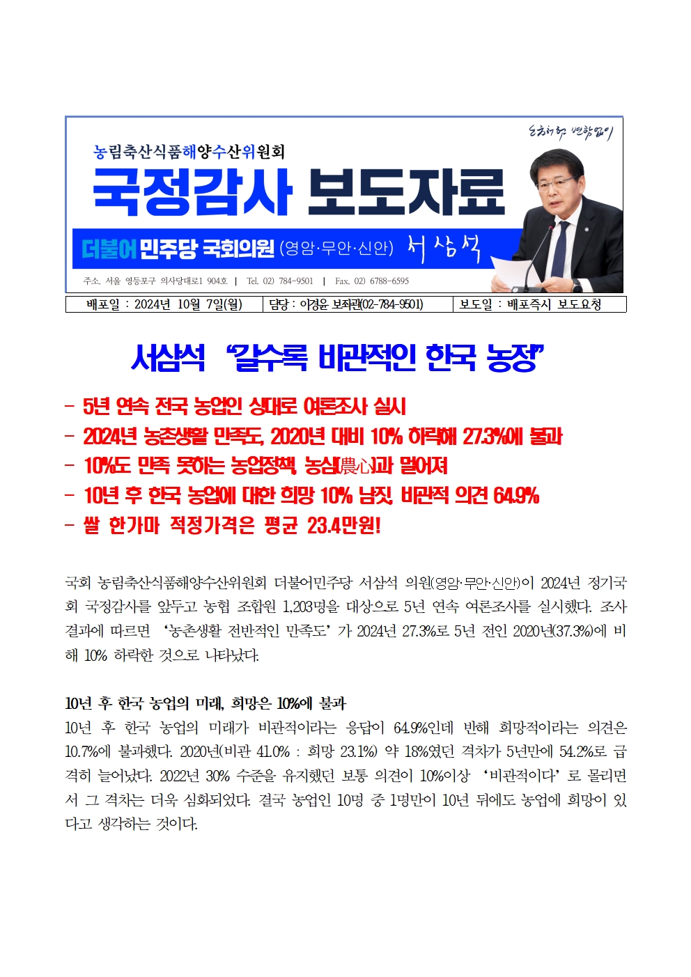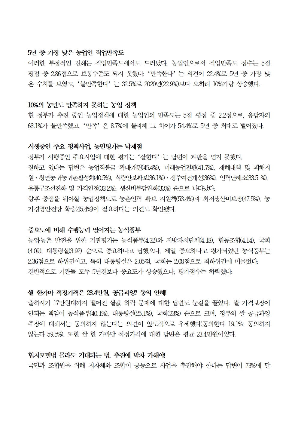 [국회의원 서삼석] 농업인 의견조사_갈수록 비관적인 한국 농정