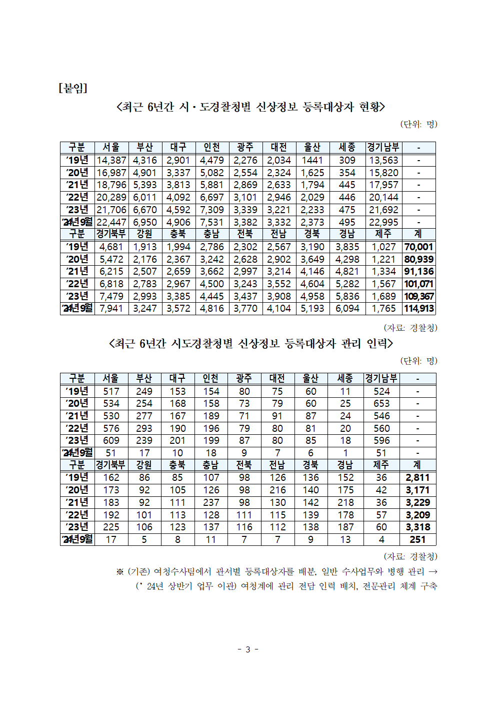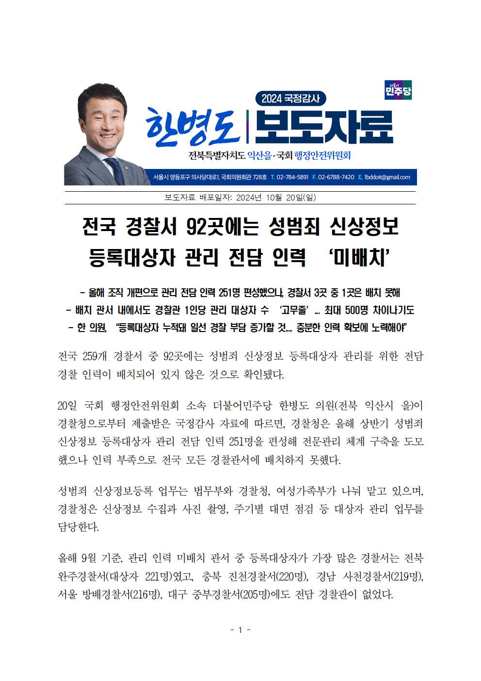 [한병도의원]2024행안위국정감사보도자료(40)전국 경찰서 92곳에는 성범죄 신상정보 등록대상자 관리 전담 인력 ‘미배치’.hwp