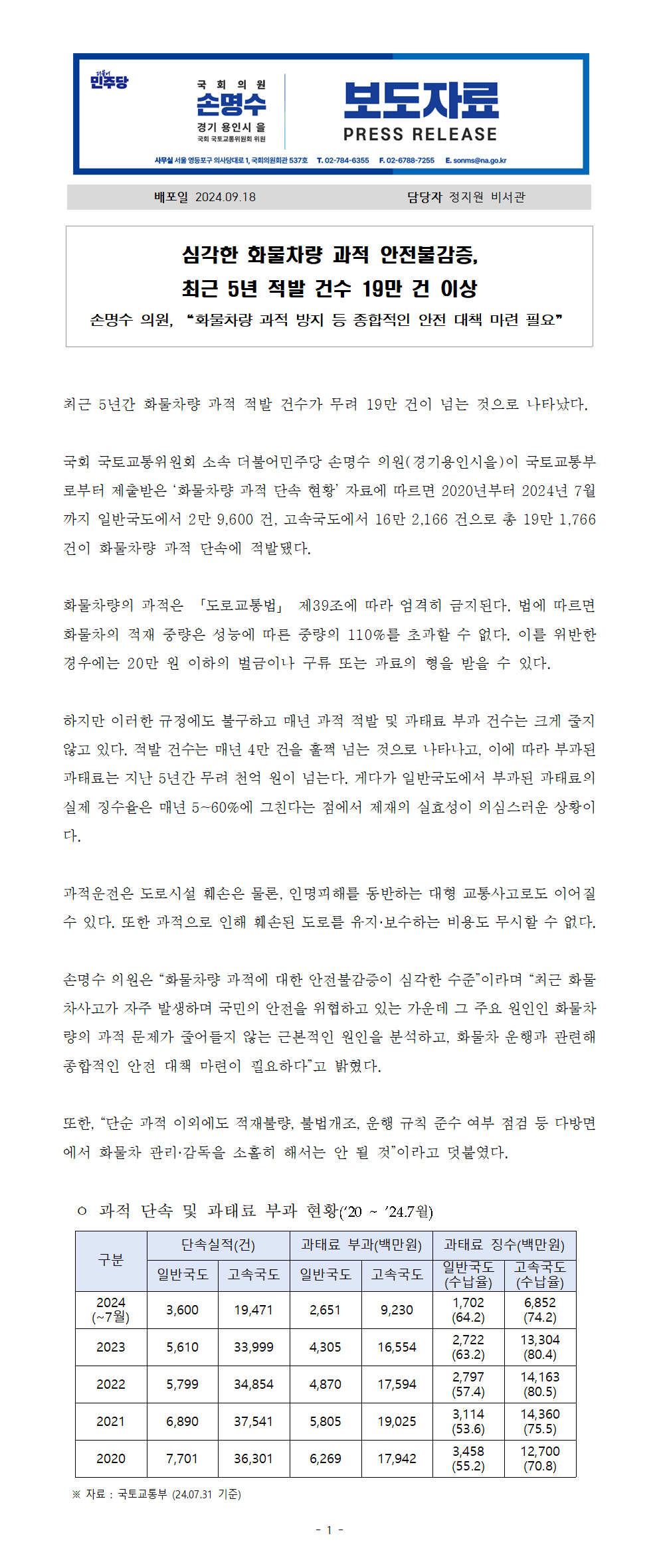 240918_손명수의원실_보도자료_심각한_화물차량_과적_안전불감증_최근_5년_적발건수_19만건.hwp