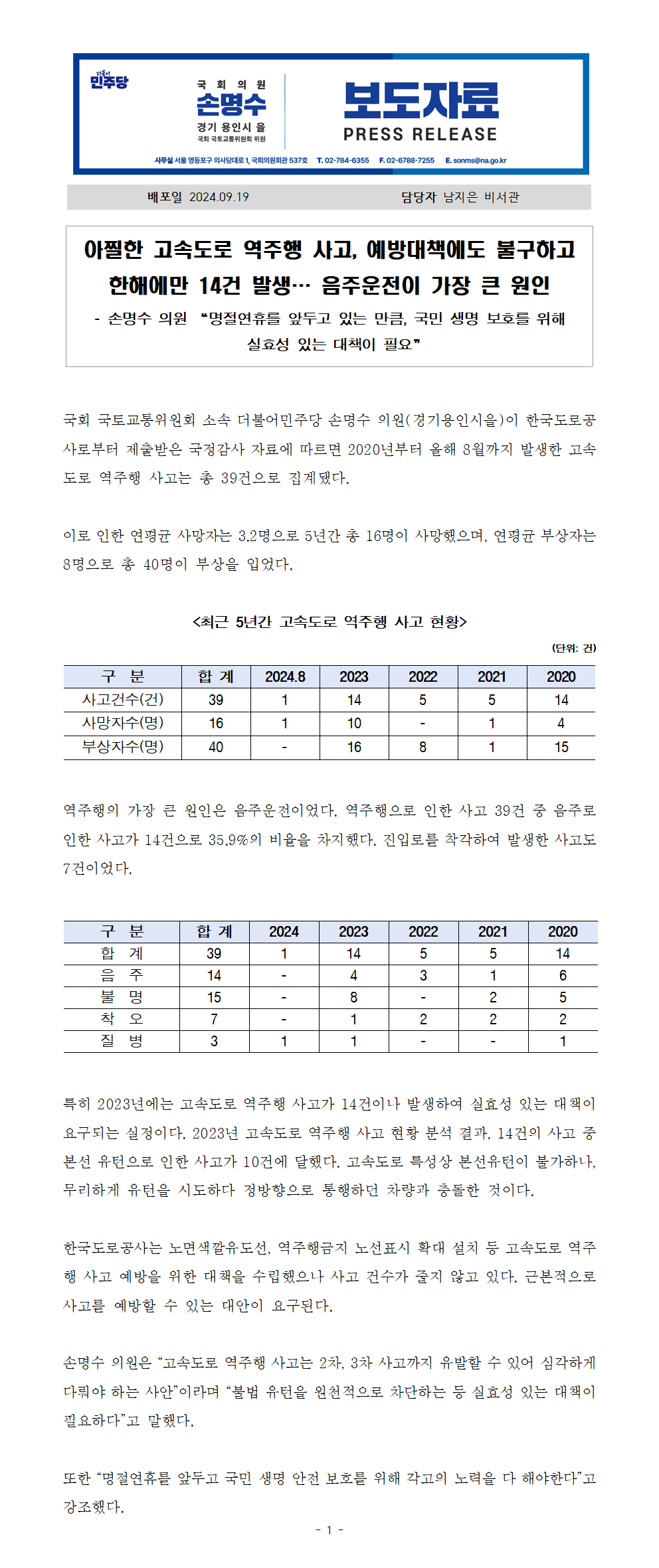 240919_손명수의원실_보도자료_고속도로_역주행_사고한해에만_14건 발생.hwp