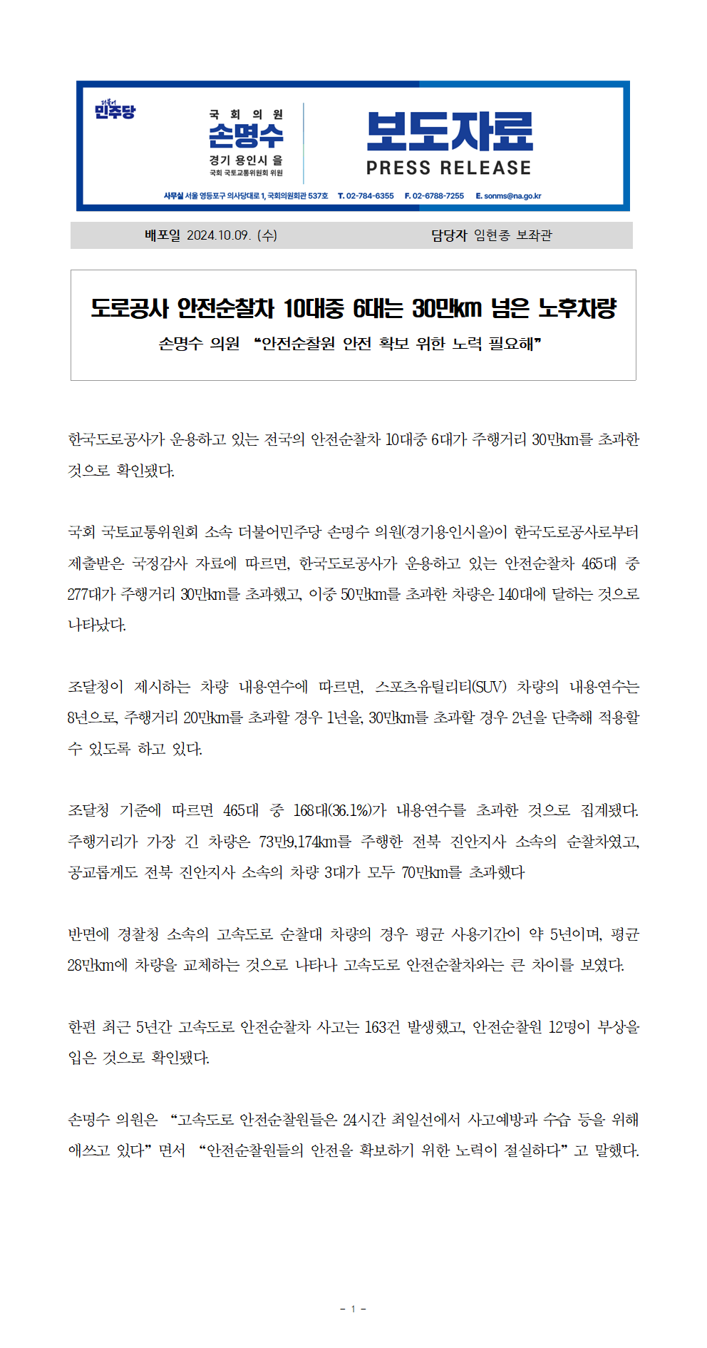 241009_손명수의원실_보도자료_도로공사_안전순찰차_10대중_6대는_30만km_넘은_노후차량.hwp