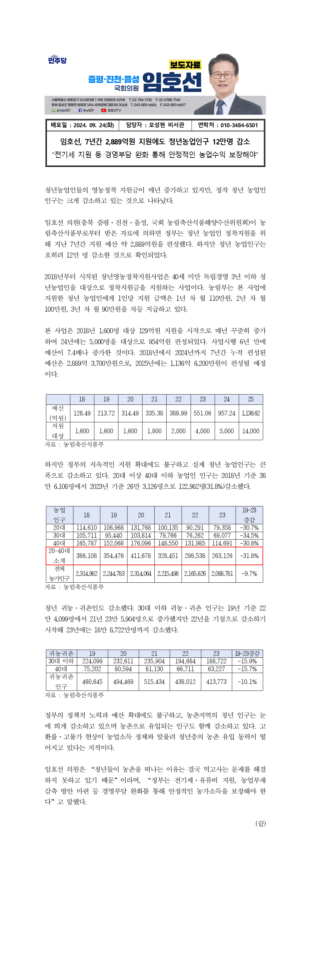 [국회의원 임호선] 7년간 2,889억원 지원에도 청년농업인구 12만명 감소