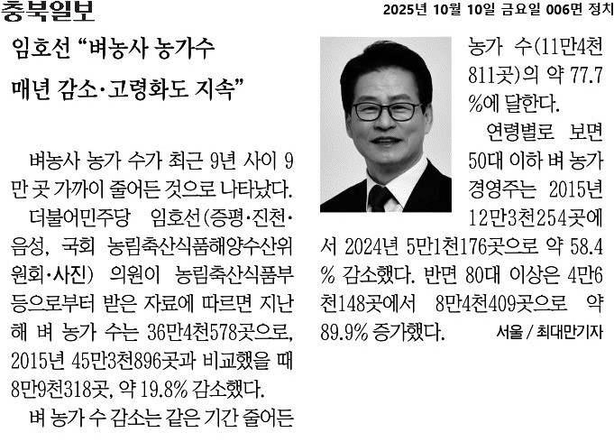 [국회의원 임호선] 임호선 "벼농사 농가수 매년 감소 고령화도 지속"