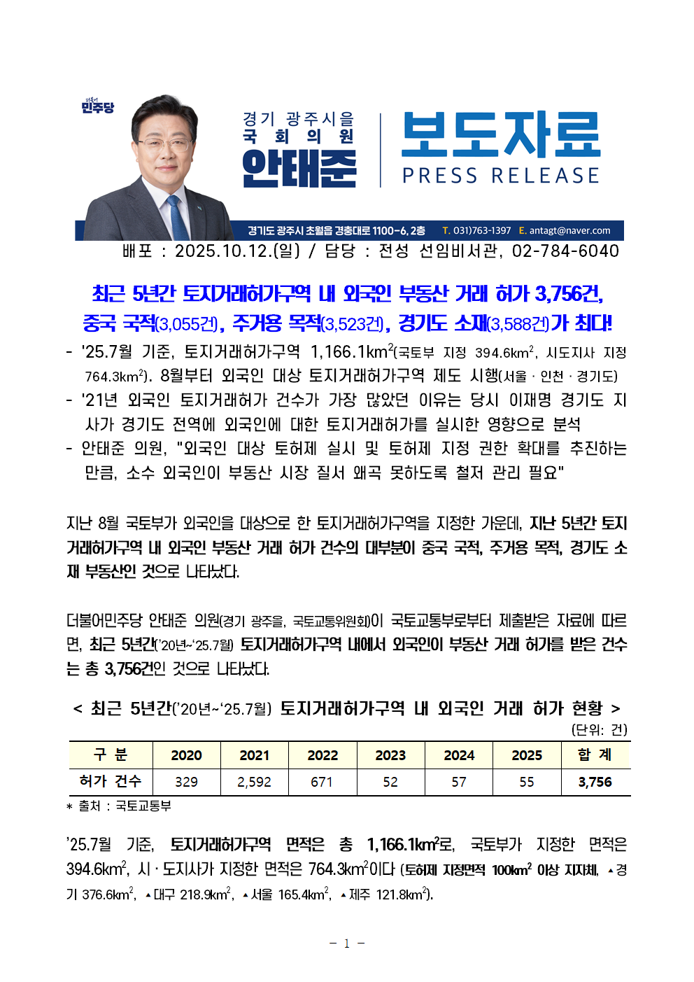 [안태준 의원 보도자료] 토허제 내 외국인 부동산 거래 허가 5년간 3,756건, 중국 국적, 주거용 목적, 경기도 소재가 최다!