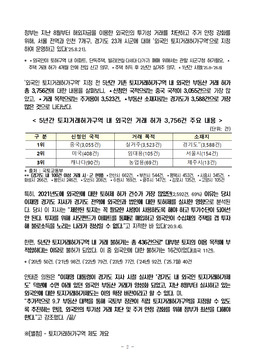 251012 (안태준 의원 보도자료) 1. 토허제 내 외국인 부동산 거래 허가 5년간 3756건 중국 국적 주거용 목적 경기도 소재가 최다!.hwp